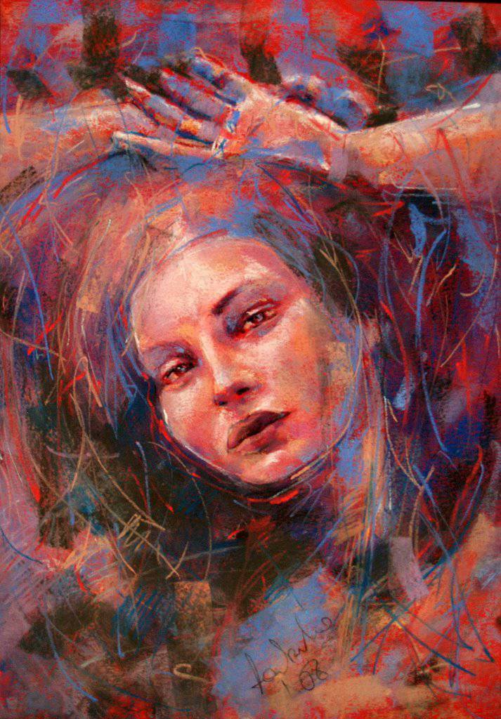 Obraz jest pełen ciepłych barw: czerwieni, niebieskości i odcieni pomarańczu, które się mieszają, tworząc dynamiczny kalejdoskop. Twarz osoby jest centralnym punktem kompozycji, otoczona wirującymi liniami, które przypominają nieco abstrakcyjny taniec. Kształty są miękkie, prawie jakby były złożone z mgły, nadając dziełu ulotny, eteryczny charakter. Atmosfera obrazu jest pełna napięcia i tajemniczości, jakby postać próbowała wyłamać się z tego kolorowego chaosu. Wygląda trochę smutno, jakby myślała o czymś ważnym. Technika artystyczna? Akrylowe impasty mieszające się z delikatnymi pastelami, tworzące wrażenie głębi. Coś jak "wow". Wrażenie chaosu jest jednocześnie uspokajające i niepokojące. Jak patrzysz na to dłużej, wywołuje różne emocje: zagubienie, spokój, a może trochę melancholii. To trochę jak dzieło sztuki współczesnej, które mógłbyś zobaczyć w nowoczesnej galerii, ale z domieszką klasyki. Dla mnie to obraz wolności, trochę smutny, trochę piękny.