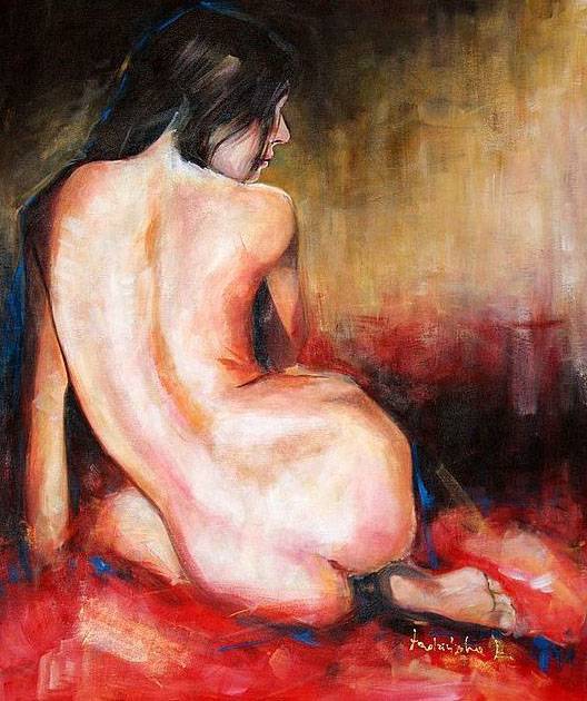 Na obrazie widzimy postać kobiety siedzącej tyłem, zanurzoną w bogatej palecie barw. Żywe czerwienie i głębokie brązy tła subtelnie kontrastują z delikatnym odcieniem skóry. Namalowane z rozmachem pociągnięcia pędzla dodają dynamiki, podczas gdy miękkie przejścia kolorów wnoszą spokój i finezję. Atmosfera jest lekko oniryczna, jakby zanurzać się w chwili ciszy. Kobieta wydaje się zamyślona, może trochę nostalgiczna. Jest tu pewna intymność, a zarazem tajemnica. Styl artysty przypomina impresjonizm, z dużym naciskiem na grę światła i cienia. Techniki plam i rozmyć podkreślają ulotność i moment uchwycony w czasie. To po prostu piękne! Obraz może wywoływać różnorodne emocje. Dla mnie, to nostalgia za niewinnością. Ale ktoś inny może poczuć samotność lub spokój. Dzieciak mógłby powiedzieć: "Ona wygląda jak mama, kiedy patrzy na morze". To dzieło to takie "wow". Takie, co zostaje w głowie na długo, jak ulubiona melodia. I może wprowadzić kogoś w stan refleksji, zachęcając do zadumy nad pięknem prostoty i natury.