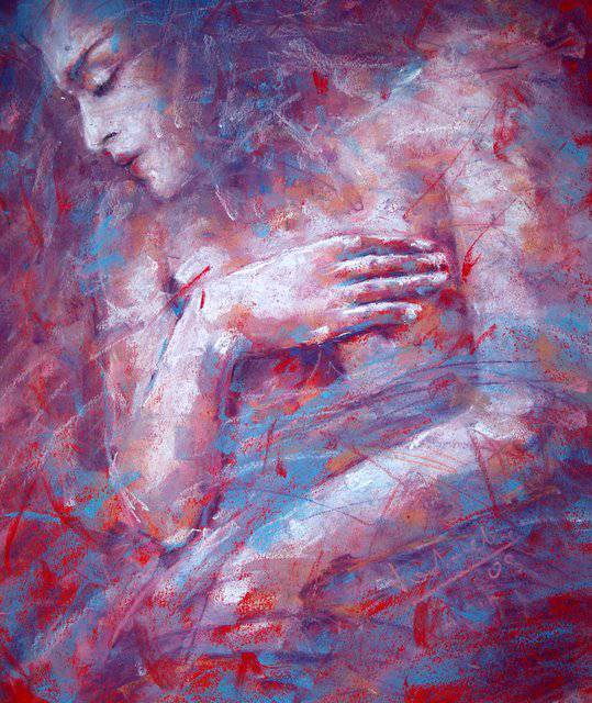 Obraz urzeka delikatnymi odcieniami różu, niebieskiego i czerwieni wijącymi się miękko na płótnie. Zarys postaci, subtelnie zarysowany, emanuje spokojem i intymnością. Ręka spoczywająca nad sercem dodaje głębi emocjonalnej, jakby chwytając chwilę refleksji. Całość kompozycji wydaje się niemal mistyczna, niczym sen na jawie. Technika malarska to połączenie impresjonizmu z abstrakcją, nieustrukturyzowana i swobodna. To jakby malowanie uczuciami lub muzyką, a nie pędzlem. Nastrój jest spokojny, ale pełen ukrytego napięcia. Gdy na to patrzę, czuję lekkie westchnienie duszy, almost a whisper. Może to obraz o miłości, a może o stracie. Tak jakby nie potrafiło się jednoznacznie określić, co kryje się za tym tłem. Może ktoś jest smutny, ale może nie? Czasem budzi we mnie poczucie zadumy, ale innym razem po prostu wywołuje ciepło. Wyobraźnia siedmiolatka krzyknęłaby "Patrz, to księżniczka, która śni o niebieskich motylach!". Całość jest jak jedna wielka tajemnica zamknięta w kolorach i formie.