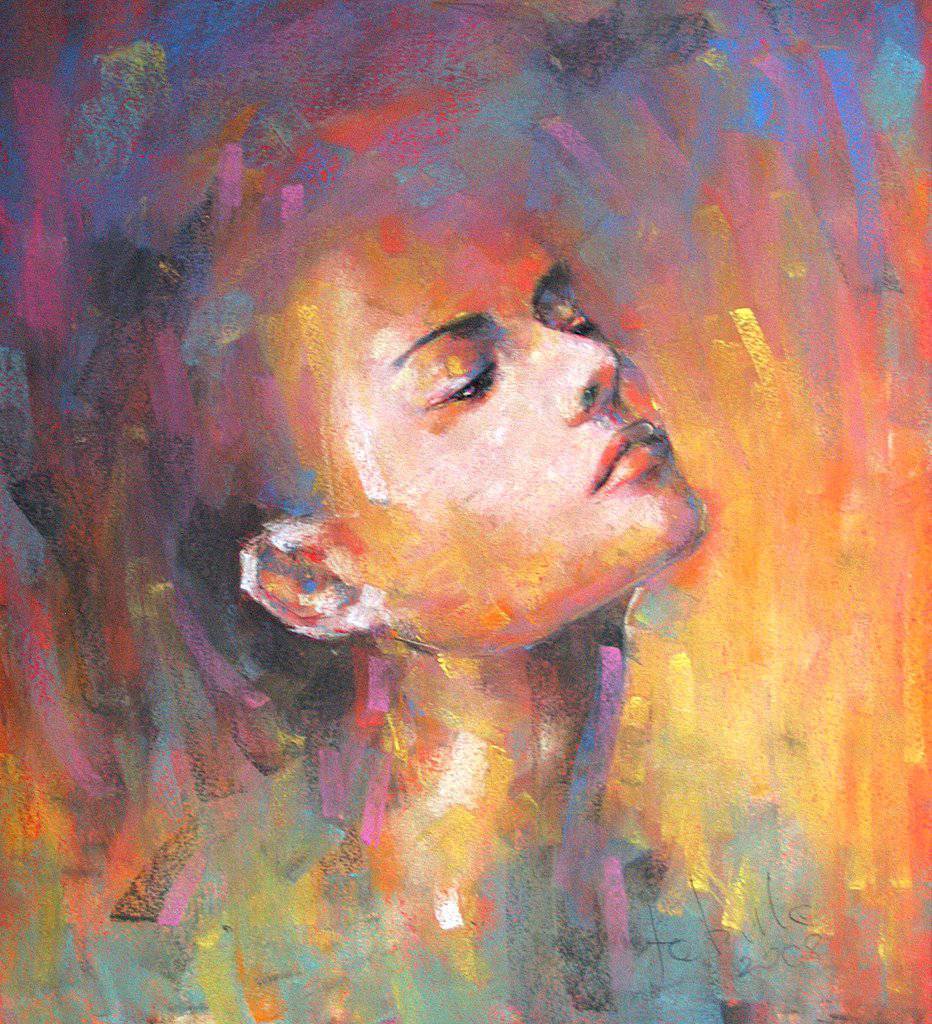 Ten obraz to eksplozja kolorów. Na pierwszy plan wysuwa się delikatna twarz kobiety, której zmysłowe rysy otulają ciepłe odcienie pomarańczu i żółci. Te barwy cudownie kontrastują z chłodniejszymi tonami fioletu i niebieskości, które wypełniają tło. Całość skład się z miękkich, ale dynamicznie nałożonych pociągnięć pędzla. To jakby artysta chciał oddać jednocześnie spokój i energię. Obraz tchnie spokojem i introspekcją. Czuję, że mogłabym patrzeć godzinami na tę twarz i zastanawiać się, o czym myśli. Może to moment ulotnej zadumy, a może ciche marzenie. Technika wydaje się być połączeniem klasycznego impresjonizmu z nowoczesnym twistem. Z całą pewnością, ten obraz wywołuje uczucie nostalgii, dodając do tego szczyptę tajemnicy i magic touch. Patrząc na niego, ma się wrażenie, że świat na chwilę zwalnia, a my możemy złapać głęboki oddech. "To wygląda jak sen" powiedziałoby dziecko. Ah, te emocje! Obraz naprawdę intryguje, zachęca do refleksji i pobudza wyobraźnię. Zachwyt przechodzi w ciekawe pytania, co mogłoby się kryć za tą spokojną twarzą.