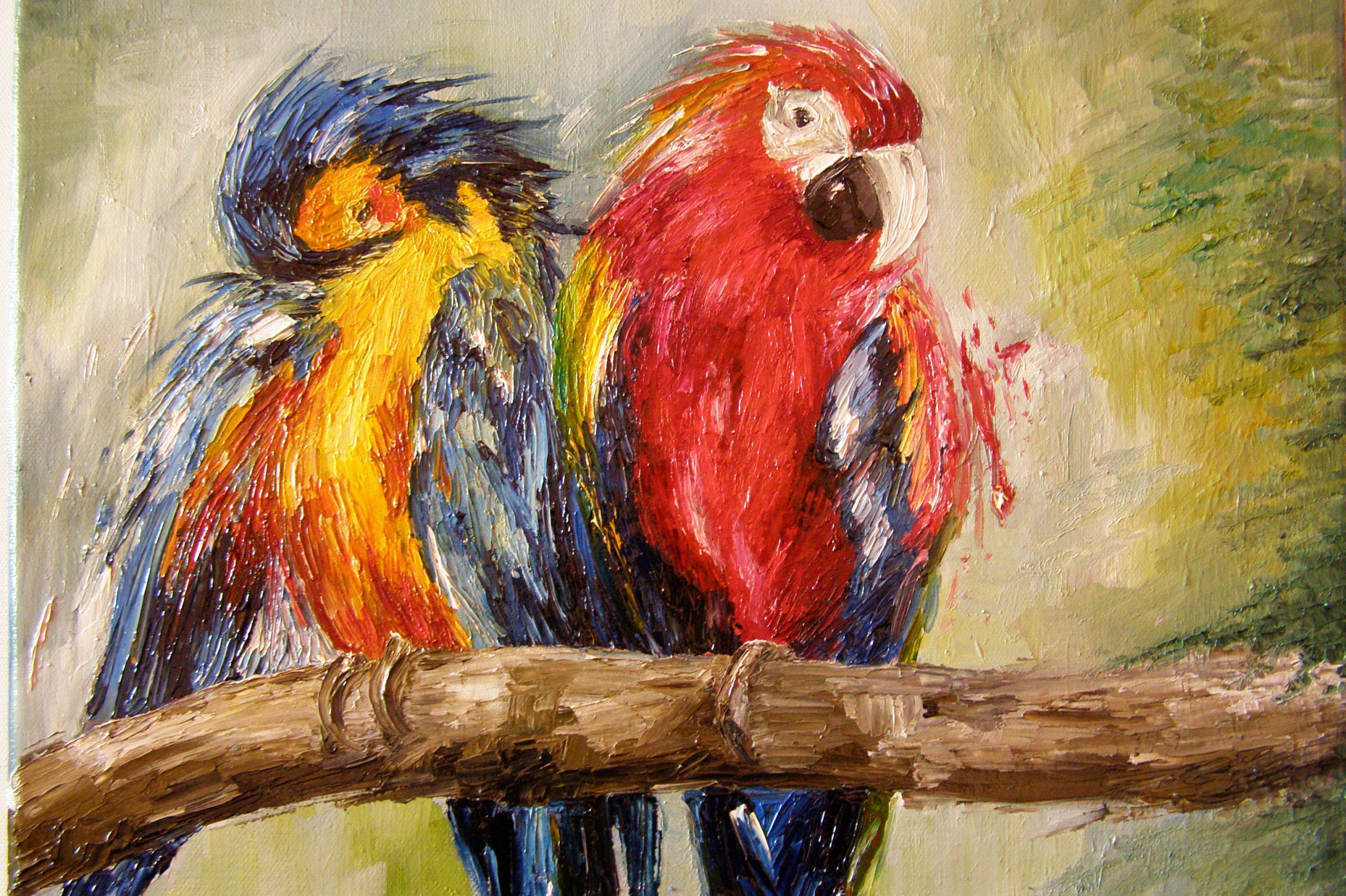 Obraz przedstawia dwie papugi o intensywnie czerwonych, niebieskich i żółtych piórach, z których każde zdaje się żyć własnym życiem. Kolory eksplodują na płótnie jak fajerwerki, tworząc wrażenie radosnego chaosu. Kompozycja jest dynamiczna, papugi siedzą obok siebie na gałęzi, sprawiając wrażenie, że chwilę temu przyleciały z tropikalnego raju. Pociągnięcia pędzlem są wyraziste i energiczne, jakby artysta chciał złapać moment ulotnego ruchu. Atmosfera jest pełna ciepła i radości, idealna na poprawę nastroju w smutny dzień. Obraz emanuje pozytywną energią, uśmiecha się do widza pełną paletą kolorów i szczerymi emocjami, zachęcając do chwili zatrzymania się i podziwu. Gdy patrzę na te papugi, myślę "freedom" - ich żywe kolory przypominają o wolności i pięknie natury. Dzieciak powiedziałby, że to takie "super" ptaki, które chciałby mieć w swoim pokoju.