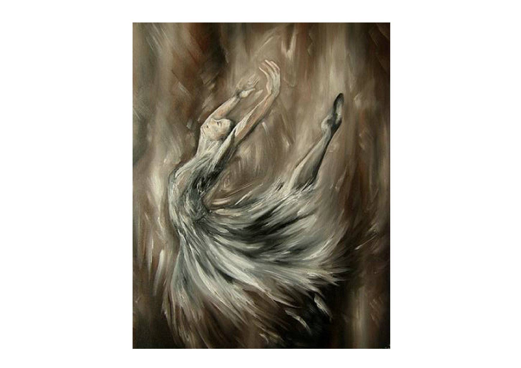 Obraz przedstawia tancerkę uchwyconą w momencie uniesienia. Kolory są stonowane, dominują brązy i beże, które płynnie przechodzą w szarości. Suknia tancerki wiruje, przypominając delikatne pióra porwane przez wiatr. Kompozycja jest dynamiczna i pełna ruchu, tancerka zdaje się niemalże unosić ponad ziemią. Atmosfera obrazu jest pełna emocji, nieco melancholijna, ale jednocześnie pełna nadziei. Styl jest impresjonistyczny, z użyciem swobodnych, miękkich pociągnięć pędzla, co nadaje dziełu lekkość i eteryczność. Uczucia, jakie budzi ten obraz, są różnorodne. Może wywoływać poczucie wolności, jakby tancerka miała za moment wznieść się do nieba. Jednocześnie w jej ruchu jest coś ulotnego, co przypomina o kruchości chwil. Technika użyta przez artystę pozwala na wniknięcie w ten magiczny, ethereal moment i zatrzymanie go na wieczność. Uuu, jak ładnie tańczy! Obserwator może zobaczyć w tym tańcu piękno chwilowego uniesienia. Patrząc na ten obraz, czułem się jakbym sam mógł zatańczyć. Albo może nawet zapomnieć o wszystkim, co mnie przytłacza. Takie dzieła przypominają, że czasem trzeba po prostu dać się porwać emocjom.
