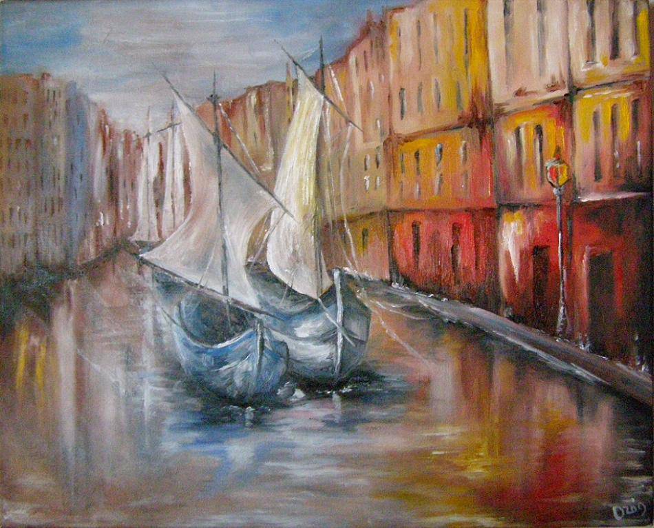 Na obrazie widzimy dwa żagle łodzi, które dryfują po spokojnym kanale. W tle widać szereg budynków, które odbijają się w wodzie, tworząc efekt lustra. Dominują tu ciepłe odcienie brązu, czerwieni i żółci, przełamane chłodnym błękitem nieba. Kompozycja obrazu jest raczej dynamiczna, a łodzie zdają się być w ruchu mimo statyczności ujęcia. Atmosfera jest trochę nostalgiczna, przypominająca stary port o świcie. Artysta użył techniki olejnej, tworząc delikatne przejścia między barwami. Styl jest nieco impresjonistyczny, z naciskiem na oddanie światła i cienia, które tańczą na powierzchni wody. Jest to owoc bogatej wyobraźni, gdzie każdy detal, od budynków po łodzie, jest potraktowany z artystyczną nonszalancją. Obraz może wywoływać różnorodne emocje. Ktoś może poczuć spokój, patrząc na niezmąconą taflę wody, inny zaś tęsknotę za podróżą w nieznane. Feelings of adventure and mystery can be sensed, jakbym sam chciał wypłynąć w rejs. Może niektórzy patrząc na niego przypomną sobie wakacyjne przygody nad morzem czy weneckie kanały. Ue małé dziecko powie, że to łódki płyna na kałuży. Niby takie proste, a jednak urzeka złożonością emocji i barw. Nie jest perfekcyjny, ale przez to właśnie tak prawdziwy. Obrazy mają tę moc, że niezależnie od czasów, w których powstają, mogą dotknąć najgłębszych zakamarków naszej duszy.