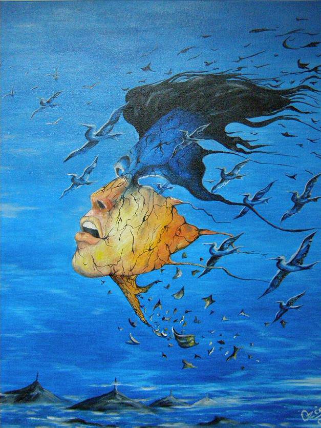 Obraz jest pełen intensywnych barw, dominują błękity i smoliste czernie. Centralna postać z popękaną twarzą wydaje się rozpadać na tysiące malutkich fragmentów, które zmieniają się w ptaki. Te ptaki unoszą się ku niebu, tworząc dynamiczny kontrast. To prawdziwa magia artystyczna. Całość jest kompozycyjnie interesująca, z twarzą wyróżnioną na tle nieba, co daje wrażenie ulotności i przemijania. Atmosfera obrazu jest surrealistyczna, emanuje tajemniczą i nieco niepokojącą aurą. Artysta użył technik kontrastowych, by oddać ruch. Dynamiczne linie i pęknięcia wzmacniają ekspresję dzieła. Patrząc na obraz, można poczuć się jak w magicznym świecie snów. Malowidło wywołuje emocje takie jak zagubienie, ale i nadzieja. Czy te ptaki są symbolem wolności? Może. Jeden mały ptaszek wyglądał, jakby się zgubił. Myślę, że dzieci mogłyby to nazwać freedom. Elementy te wzbudzają refleksję na temat ludzkiej natury, kruchości i dążenia do czegoś więcej. Jeszcze jedno spojrzenie i... czuję, jakbym tam była. Coś w tym obrazie mówi mi, że życie jest podróżą.