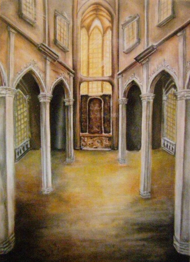 Obraz przedstawia wnętrze majestatycznej katedry, gdzie ciepłe odcienie złota i brązu harmonijnie łączą się z szarą paletą kolumn. Długie, smukłe kształty architektoniczne wprowadzają poczucie spokoju i elegancji. Światło sączy się przez wysokie witraże, dodając tajemniczego, niemal magicznego uroku całej scenie. Tak sobie myślę, ciekawe jak się tam echo rozchodzi. Artysta mistrzowsko połączył gotycki styl z delikatnym powiewem nowoczesności, co czyni ten obraz intrygującym. Czuć tu nostalgiczny nastrój, jakby miejsce to skrywało dawne, zapomniane historie i sekrety. What a stunning place! Technika użyta w dziele to prawdopodobnie akwarela lub olej, co nadaje głębi i miękkości. Obraz może wzbudzać poczucie zadumy, refleksji nad przemijaniem czasu. Czy zastanawiałeś się kiedyś, ile wydarzeń widziały te ściany? Dla mnie to przypomina spokojne niedzielne popołudnie, gdzie czas zatrzymuje się na chwilę. Podziwiając to dzieło, można poczuć, że w każdej chwili ktoś może wejść do tego wnętrza, przerywając magiczną ciszę przestrzeni. Każdy szczegół wydaje się szeptać własną historię, zachęcając do odkrycia nowych perspektyw.