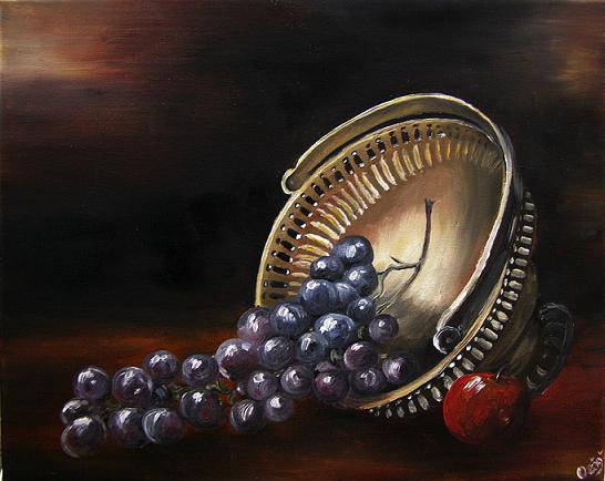 Obraz ukazuje misternie skomponowaną martwą naturę. Dominują tu głębokie odcienie bordowego i ciemnej zieleni, które tworzą kontrast z jasnymi refleksami światła odbijającego się od metalowej miski. Gładka powierzchnia winogron połyskuje w świetle, przykuwając wzrok swoją realistyczną miękkością. Całość kompozycji jest dynamiczna, dzięki umiejscowieniu owoców wychodzących poza krawędź miski, co dodaje odrobiny chaosu tej harmonijnej scenie. Artysta użył techniki olejnej, co pozwoliło uzyskać bogactwo tekstur i subtelną grę światła. Atmosfera obrazu jest nostalgiczna, niemalże melancholijna, przywołująca na myśl chwile zamyślenia. Emocje? No cóż, może trochę głodu albo chęci doświadczenia prostych przyjemności. Patrząc na ten obraz, czuję spokój, jakby świat na chwilę zwolnił tempo. Wow! Kolory wibrują, a jednocześnie uspokajają. Ten obraz mógłby zmobilizować do zastanowienia się nad chwilowością i pięknem codziennych rzeczy. It's just beautiful. Tak jak mówił mały chłopiec: "Mama, ja też chcę takie winogronka!". Czuć, że artysta włożył tu kawałek siebie, wplatając duszę w każdy pociągnięcie pędzla.