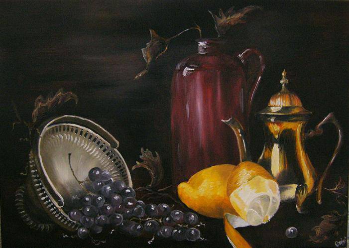 Obraz przedstawia klasyczną martwą naturę z butelką, dzbankiem, miską winogron i cytryną. Kolory są stonowane, dominują ciemne brązy oraz złociste i żółte akcenty. Kompozycja jest zrównoważona, a elementy są rozmieszczone harmonijnie. Artysta użył subtelnych pociągnięć pędzla, które nadają całości elegancji i wrażenia płynności. Obraz emanuje spokojem, lecz jednocześnie wprowadza nutkę tajemniczości. Jest jak stary film noir: cichy, ale pełen emocji. Styl przypomina dzieła mistrzów z epoki baroku, gdzie światło i cień odgrywają kluczową rolę. Technika chiaroscuro została zastosowana perfekcyjnie, co dodaje głębi i dramatyzmu. Patrząc na ten obraz, można poczuć pewien rozdźwięk między spokojem a nieuchwytną melancholią. To uczucie balansowania na granicy spokoju i niepokoju. Winogrona wyglądają tak soczyście, że aż chciałoby się je zjeść. A cytryna jest jak kawałek słońca, które wpadło na chwilę do ciemnego pokoju. Ten obraz mógłby wisieć w eleganckim salonie, ale równie dobrze pasowałby do przytulnego kącika, gdzie można się zaszyć z książką i filiżanką herbaty. I really like the shiny pot. Wyobraźnia zaczyna pracować na pełnych obrotach, marzysz o smakach i zapachach, które unoszą się z tych elementów sceny. Czyż to nie piękne, jak drobne detale mogą wywołać tyle emocji? Niby tylko owoce i naczynia, ale jak zaczarowane. To jeden z tych obrazów, które zapadają w pamięć.