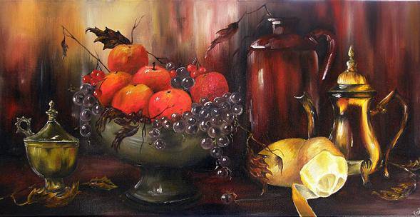 Na obrazie widać piękną martwą naturę z owocami w roli głównej. Soczyste jabłka i kiście ciemnych winogron wypełniają ozdobną misę, otoczone złocistymi akcentami mosiężnych naczyń. Tło jest przydymione, pełne brązów i ciepłych odcieni bursztynu, które dodają głębi i tajemniczości. Tworzy to atmosferę nostalgii, jakby wspomnienie z dzieciństwa, ciepłe i przytulne. Artysta użył klasycznej techniki olejnej, z widocznymi, miękkimi pociągnięciami pędzla, które budują warstwy i tekstury. Cienie subtelnie obejmują przedmioty, co daje wrażenie trójwymiarowości. Cała kompozycja jest dobrze przemyślana, przemyka pomiędzy swobodnym rozmieszczeniem a wyważonym układem przedmiotów. Ten obraz jest jak cozy corner w starym domu. Może budzić w odbiorcy poczucie spokoju, bezpieczeństwa, a nawet trochę głodu. Myślę sobie: "Look at those grapes!", są niemal jak prawdziwe. Dla mnie ten obraz to trochę jak bajka, pełna ukrytych znaczeń i historii do odkrycia. Patrząc na niego, można prawie usłyszeć skrzypienie drewnianej podłogi, wyobrażając sobie szelest liści. A kanske maluch by powiedział: "Te jabłka wyglądają jak cukierki". Jest w tym coś z magii codzienności, co zachęca, by na chwilę przystanąć i po prostu być. I choć to tylko martwa natura, tętni życiem, przypominając o pięknie ukrytym w prostych rzeczach.