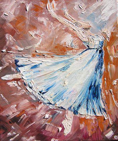 Obraz pokazuje piękną srebrzystą baletnicę, która unosi się w tańcu pośrodku wirujących barw. Dominują tu ciepłe odcienie brązu i chłodne błękity. Suknia tancerki rozpościera się niczym skrzydła motyla, z każdym pociągnięciem pędzla artysta nadaje jej lekkości i ruchu. Wygląda, jakby zaraz miała wzlecieć w powietrze. Mieszanka dynamicznych szpachli farby i delikatnych pociągnięć tworzy tło pełne energii i pasji. Styl artystyczny jest pełen ekspresji, świadczący o swobodnym i impulsywnym podejściu do tworzenia. Wywołuje w człowieku uczucie uniesienia, jakby chciało się dołączyć do tego magicznego tańca. Emocje kipią, serce bije szybciej na widok tej przepełnionej life kompozycji. Baletnica zdaje się tańczyć nie tylko na płótnie, ale i w naszych duszach. Dla mnie, to jakby chwila zamrożonej w czasie magii. Mały chłopczyk powiedziałby "Ona skacze jak w bajce!", trafiając w sedno tego marzenia. Można niemal poczuć nuty muzyki, która nadaje rytm temu spettacolare przedstawieniu.