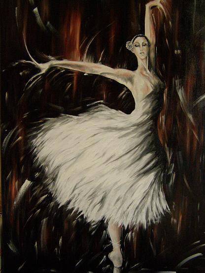 Obraz przedstawia tancerkę baletową w ruchu, gdzie dominują ciemne i jasne kontrasty. Czerwono-brązowe tło zdaje się być poruszonym zasłoną nocy, a postać baletnicy przykuwa uwagę swoim jasnym, niemal eterycznym strojem. Suknia jest pełna lekkości, rozmazana i dynamiczna, co dodaje obrazu ruchu. Tancerka wygląda jakby unosila sie nad ziemią, jej figura jest smukła, ręce wyciągnięte w jednym kierunku, tworzą delikatny łuk. To wszystko dodaje kompozycji harmonii i finezji. Atmosfera obrazu jest tajemnicza i pełna gracji. Czuje się pewną nostalgię, jakby chwila uchwycona była zapisem ulotnego momentu emocji. Technika malarska, z wyraźnymi pociągnięciami pędzla, przypomina o impresjonistycznym podejściu do ruchu i światła. Te dynamiczne ślady na tle wyglądają jak gra świateł i cieni – very dynamic. Coś w tym obrazie jest naprawdę poruszającego. Mogę wyobrazić sobie tancerza na scenie, z publicznością zamarłą w zachwycie. Tancerka wydaje się zamyślona, a jej uroda i skupienie tworzą obraz pełen emocji. Uczucia, które wzbudza, to spokój i podziw. Mała dziewczynka mogłaby powiedzieć: "Ona jest księżniczką tańca!". Obraz zachęca do refleksji nad pięknem ulotnych chwil i siły, jaka kryje się w delikatności.