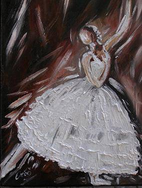 Na obrazie widzimy baletnicę, która wiruje w otoczeniu tajemniczych, ciemnych barw. Dominującym kolorem jest ciepły brąz, który otacza jej sylwetkę niczym mglisty welon. Baletnica ubrana jest w białą suknię, pełną tekstur i detali. Suknia wydaje się falować, jakby była żywa, a każdy jej plisowany fragment zdaje się delikatnie migotać. Artysta zastosował technikę impasto, nadając obrazowi trójwymiarowy charakter, co sprawia, że suknia niemal wychodzi poza płótno. To jest jak magiczne, jakby była prawdziwa. Atmosfera całego obrazu jest pełna dynamizmu i elegancji. Subtelność ruchu baletnicy sprawia, że czujemy się jakbyśmy byli częścią tej chwili, obserwując taniec żywiołów. Styl artysty jest ekspresyjny, a dynamiczne pociągnięcia pędzla podkreślają ruch i emocję. Obraz emanuje poczuciem pasji, wolności i ulotności chwili. Obserwując ten obraz, można poczuć pewną nostalgiczną tęsknotę za doskonałością, którą reprezentuje taniec. Myślę, że ma w sobie coś „dreamlike”, jakby przenosił nas do innej rzeczywistości. Widz może czuć się zainspirowany do odkrywania piękna w ruchu i chwili. Na końcu przychodzi mi do głowy myśl: ale piękna baletnica, chciałbym tak tańczyć! To dzieło otwiera przed nami drzwi do świata marzeń, gdzie każde uderzenie serca to nowy krok w tańcu.
