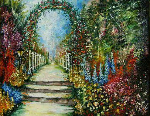 Na obrazie widzimy urokliwą alejkę prowadzącą przez bujny ogród pełen kwiatów w różnorodnych kolorach. Zieleń miesza się z czerwieniami i żółciami, tworząc prawdziwy kalejdoskop barw. Ścieżkę zdobi kwiecisty łuk, przywołujący na myśl tajemniczy entrance do magicznej krainy. Kompozycja obrazu jest niezwykle harmonijna, prowadząc wzrok obserwatora w głąb sceny. Atmosfera emanuje spokojem i harmonią, zapraszając do wyciszenia się i chwili refleksji. Technika artysty jest pełna ekspresji, z wyraźnymi pociągnięciami pędzla, które dodają dynamizmu. To jak malowanie palcami w kałuży pełnej farb. Widz może poczuć ciepło letniego popołudnia i usłyszeć delikatne szelesty liści. Obraz tchnie pozytywną energią, która zachęca do marzeń. Psy będzie biegał po tej ścieżce. Patrząc na to dzieło, można poczuć się jak w środku baśniowej opowieści, gdzie każda roślina ma swoją historię do opowiedzenia. Personalnie, widzę w nim światło nadziei i pocieszenie, coś, co przypomina mi o prostocie szczęścia.