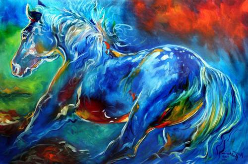 Obraz przedstawia pięknego konia w błękitach i czerwieniach, skąpanego w dynamicznych pociągnięciach pędzla. Kolory mieszają się jak w kalejdoskopie, tworząc rozmazane linie i niejasne kontury. Dominuje intensywny niebieski, przechodzący w ciepłe czerwienie i zieleni, nadając mu energii i ruchu. Kompozycja jest pełna żywiołowości, jakby artysta uchwycił chwilowy galop w pastelowym krajobrazie. Atmosfera jest pełna napięcia i ekspresji, a może nawet chaosu, co sugeruje burzę emocjonalną. Styl malarski to czysta ekspresja, użyto wyraźnych, energicznych pociągnięć, które dodają nieco mistycznej otoczki. Obraz wywołuje różne interpretacje u odbiorcy: z jednej strony, można odczuwać zachwyt nad ukazanym pięknem i siłą oraz techniką, która przenosi nas w magiczny świat. Z drugiej, widać w nim pewien niepokój, jakby koń był świadkiem czegoś nieco crazy. 7-latek mógłby powiedzieć "Koń wygląda jak tęcza!" Widz może poczuć się wręcz zafrapowany energią wypływającą z tego dzieła, jakby wnosiło do wnętrza jakąś nieskończoną siłę.