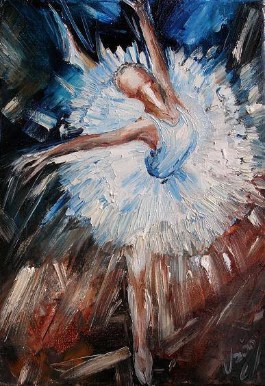 Na obrazie widać baletnicę, która tańczy z gracją. Jej sukienka mieni się białymi i niebieskimi tonami, tworząc dynamiczny kontrast z ciemniejszym, nieco surrealistycznym tłem. Pociągnięcia pędzla są energiczne i nieco chaotyczne, nadając obrazowi ferwor ruchu. Tkanina sukni wiruje, nadając poczucie lekkości i ulotności chwili. Atmosfera jest magiczna, niemal jakbyśmy nagle znaleźli się w środku spektaklu, gdzie czas zwalnia. Kolory są dość intensywne, te błękity i biele. Czuję, że artysta użył techniki impastu, co daje teksturalną głębię dziełu. Baletnica wydaje się niemal żywa, jakby zaraz miała unieść się z płótna. Dla odbiorcy to może być chwila refleksji nad ulotnym pięknem sztuki i życia. Wow, to jest jak sen! Dziecięcym spojrzeniem można by powiedzieć "Ona fruwa!". Patrząc na to, człowiek może poczuć dziwną tęsknotę, jakby chciał zatrzymać tę chwilę w wieczności. Unikalny flow obrazu sprawia, że każde spojrzenie odkrywa coś nowego.