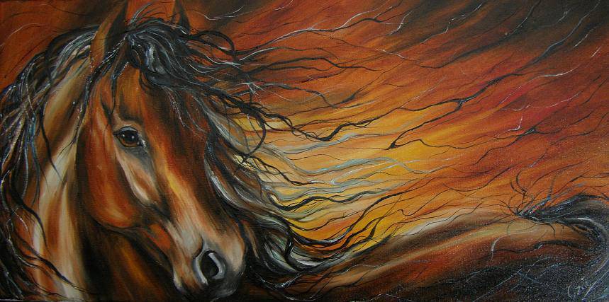 Na obrazie widzimy majestatycznego konia, o pięknej, rozwianej grzywie, która jakby tańczyła w rytm wiatru. Dominują odcienie brązu i złota, co przypomina gorący zachód słońca. Tło zdaje się wirującą mieszanką barw, co nadaje kompozycji dynamikę i ruch. Artysta zastosował płynne, zdecydowane pociągnięcia pędzla, co dodaje obrazowi energii i życia. Technika wydaje się być mieszaniną realizmu i impresji, co sprawia, że obraz jest zarówno dokładny, jak i ulotny. Atmosfera dzieła jest niezwykle żywa. Można niemal poczuć powiew wiatru i ciepło ostatnich promieni słońca. Styl artysty sprawia, że widz czuje się niemal jakby stał obok tego wspaniałego stworzenia, obserwując jego dzikość i wolność. To właśnie poczucie "freedom", które artysta tak pięknie uchwycił, może wywoływać wzruszenie i marzenie o swobodzie. Kiedy patrzę na ten obraz, serce przyspiesza, a wyobraźnia biegnie daleko w przestworza. Jestem pewna, że siedmiolatek powiedziałby: "Konie są najszybsze na świecie!". W tym dziele kryje się taka nieskrępowana radość i ekscytacja. Karuzela emocji wiruje, a ja czuję wdzięczność za taki moment piękna.