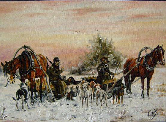 Na obrazie dominuje zimowa scena przedstawiająca myśliwych z psami i zaprzęgami konnymi. Śnieg pokrywa ziemię, tworząc chłodny, biały krajobraz, który kontrastuje z ciepłymi odcieniami nieba. Artysta użył delikatnych różowych i pomarańczowych barw, by oddać magię wschodu lub zachodu słońca. Dwa konie, mocne i dumnie stojące, wyróżniają się na tle pejzażu. Uczestnictwo psów dodaje dynamiki całej kompozycji, jakby czekały na znak do działania. Każdy element obrazu, od detali w ubraniach myśliwych po umaszczenie psów, jest oddany z niezwykłą precyzją. Malarz posłużył się techniką olejną, co nadaje dziełu głębi i faktury. Atmosfera obrazu jest jednocześnie spokojna i pełna napięcia. Czuje się tu ciszę natury, przerwaną jedynie oddechami zwierząt i skrzypieniem śniegu pod kopytami. Ten idylliczny nastrój może jednak wywołać w widzu nostalgię za dawnymi czasami. Może to być escape zawirowania codziennego życia w miejsce, gdzie czas płynie wolniej. Patrząc na to dzieło, można poczuć się jakby w innym świecie, gdzie nie liczy się nic poza chwilą. To wręcz zaprasza, by zamarzyć o dawnych opowieściach przy ogniu. Zastanawiam się, jakie historie kryją się za ludźmi przedstawionymi na obrazie. Czy to dzień pełen przygód, outdoor magic, a może zwykła rutyna myśliwskiego życia? Dla 7-latka, to będzie "Obraz z końmi i pieskami na śniegu!" I to powiedziałbym z uśmiechem, bo przypomina mi zabawy na dworze. Artysta oddał piękno zimy tak, że prawie czuje się powiew zimnego powietrza.