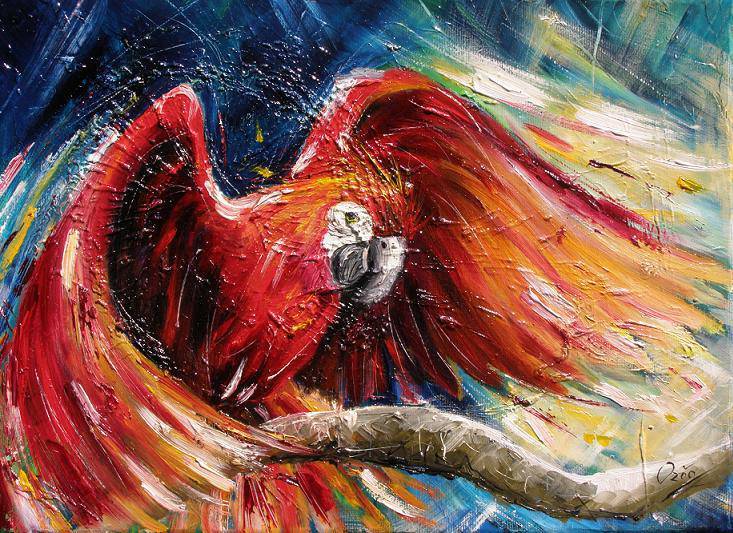Ten obraz to prawdziwy wybuch kolorów. Dominuje tu intensywna czerwień papugi, która zdaje się eksplodować w dynamicznym tańcu szczotek malarskich. Otaczają ją smugi pomarańczowe i złote, a całość na tle głębokiego niebieskiego nieba lub oceanu. Papuga jest jakby w ruchu, a jej skrzydła tworzą majestatyczne łuki, które nadają całości energii. Wszystko jest niemalże ekspresjonistyczne, pełne ruchu i życia. Artysta używa impastu, tworząc grubo nałożone warstwy farby, które dają wrażenie trójwymiarowości. Technika ta sprawia, że obraz jest niemalże tactile. Atmosfera? No cóż, jest tutaj prawdziwe "wow" efekt, pełen pasji i dzikości. Radość, fascynacja, może nawet trochę chaosu. Obraz wywołuje dreszcz emocji i sprawia, że czujemy się częścią tego dynamicznego momentu. Patrząc na to, aż chce się powiedzieć: "Papuga leci szybko!". To, co najbardziej mnie urzeka, to wolność uchwycona w tej kompozycji. Czysta eksplozja barw i energii, jakby ktoś uchwycił moment uniesienia w magiczny sposób.