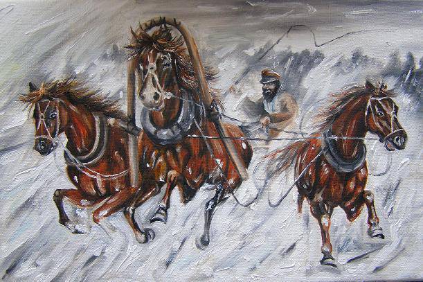 Obraz przedstawia dynamiczną scenę, w której trzy konie galopują przez burzę śnieżną. Kolory są intensywne i pełne kontrastu. Brązy, biele i szarości łączą się w żywą kompozycję, emanując energią i ruchem. Sylwetki koni są potężne i pełne dynamizmu. Każdy muzyk konia wydaje się wibrować od siły i determinacji. Artysta zastosował dynamiczne pociągnięcia pędzla, a tekstura farby dodaje głębi. Nastrój obrazu jest pełen napięcia i dramatyzmu. Mimo surowej aury czuć w tej scenie heat of the moment, czegoś niepowstrzymanego. Styl malarza jest ekspresyjny i pełen życia. Tło jest rozmyte i pełne ruchu, co podkreśla niepogodną aurę. Konie są sercem kompozycji, a ich siła dominuje przestrzeń. Możliwe, że obraz wywołuje emocje związane z wolnością, energią i determinacją. Odbiorca może poczuć chłód zimy, jednocześnie podziwiając niepohamowaną siłę natury. Takie malunki przypominają mi o tym, jaka nasza codzienność bywa dzika i nieprzewidywalna. A ten pan na koniu, wygląda, jakby jechał jak wicher. Czy nie wydaje się, że konie są jak żywe? Obraz jest świetnym przykładem emocjonalnego realizmu, który zabiera widza w podróż pełną wrażeń.