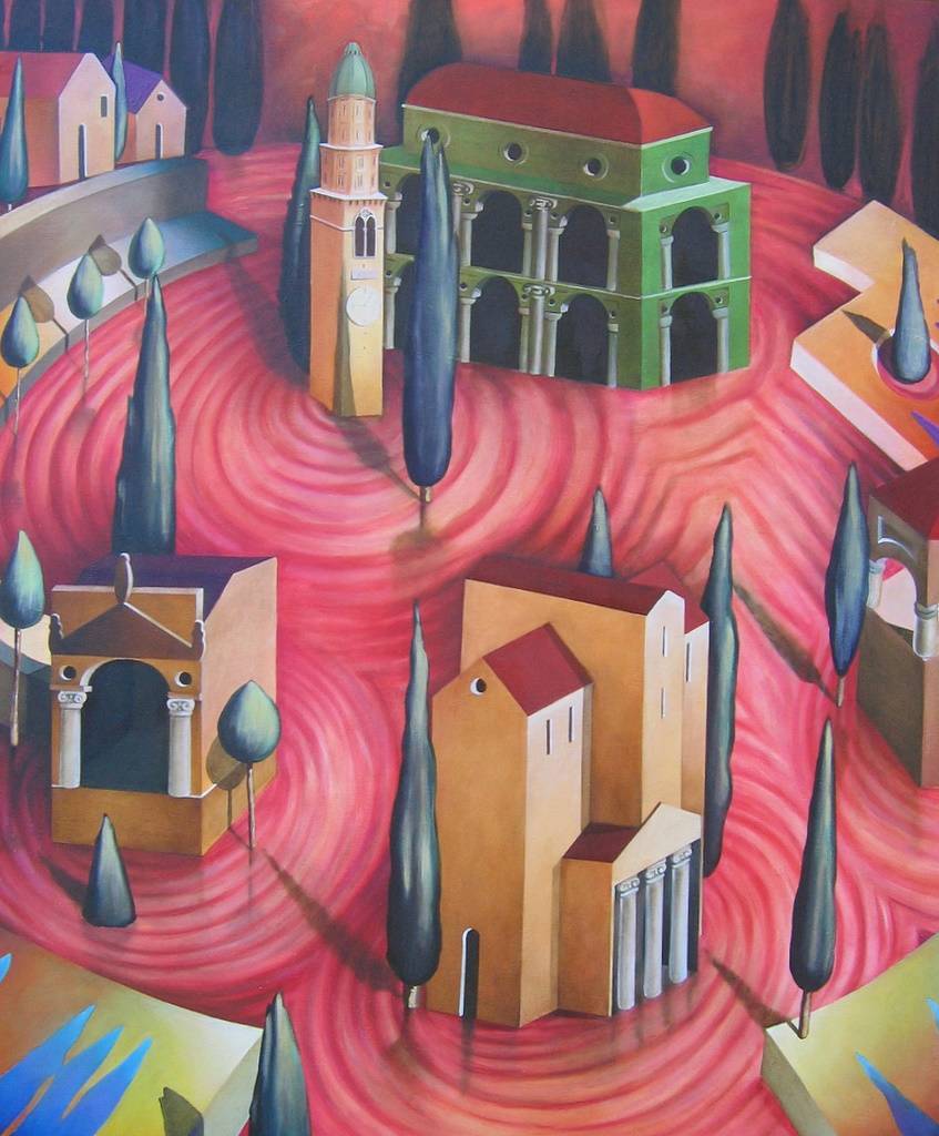 Obraz tętni życiem i kolorami. Falujące, różowe tło przypomina płynący krajobraz, który otacza różnorodne budowle i smukłe cyprysy. Architektura utrzymana jest w tonacji piaskowca, z intensywnie zielonym gmachami kontrastującymi z resztą kompozycji. Budynki są geometryczne, czasem wydają się niemal surrealistyczne, a wysokie wieże wyglądają jak wyjęte z bajkowej scenerii. Artysta posługuje się jasnymi, nasyconymi barwami, z szerokimi pociągnięciami pędzla, które tworzą dynamiczny ruch na powierzchni obrazu. Praca emanuje spokojem, ale i tajemniczością, jakby miasta miały swoje sekrety. Technika przypomina trochę styl surrealistyczny, z nutką abstrakcji, gdzie kształty są uproszczone, a proporcje zmieniają rzeczywistość. To obraz, który może wywoływać wrażenie zagubienia, ale też zachwytu. Jakby wołał: "Spójrz na mnie, odkryj moje tajemnice". Może wywoływać u widza uczucie nostalgii, marzeń o podróżach i odkrywaniu nieznanego. Jeden z widoków przypomina miasto wyjęte z ilustracji książek dla dzieci, a w mojej głowie brzmi głos dziecka: "To jest kraina, gdzie drzewa mówią!". Obraz zachęca do snucia osobistych refleksji i marzeń, zwiększając naszą ciekawość świata. A może to tylko illusory landscape pełne urokliwych miejsc do odkrycia? Każdy znajdzie tu coś dla siebie.