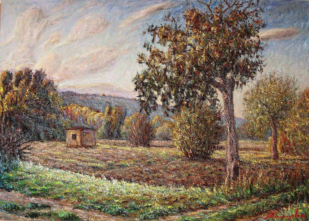 Na obrazie widzimy sielankowy krajobraz jesienny. Dominują ciepłe barwy, takie jak złoto, brąz i zieleń, które tworzą harmonijną kompozycję natury. Drzewa zdają się być pełne życia, a ich liście tańczą w delikatnym wietrze. Przykuwającym uwagę elementem jest mała chatka stojąca samotnie na środku pola, niczym tajemnicza zagadka. Atmosfera obrazu jest spokojna, niemal medytacyjna, ale ma w sobie coś nieuchwytnego. Słońce zachodzące na horyzoncie nadaje scenie magiczny golden touch. Artysta użył techniki impastu, co nadaje fakturze obrazu głębokości i dynamiki. Kształty są zarysowane mocnymi pociągnięciami pędzla, co dodaje energii całemu dziełu. Obraz sprawia, że chcemy zanurzyć się w ten idylliczny świat, niemal czujemy zapach trawy. Kojarzy mi się to z beztroskimi chwilami dzieciństwa. „Tam jest domek!”. Dzieło może budzić różnorodne emocje — nostalgia, pragnienie spokoju, a nawet odrobinę melancholii. To miejsce, które przekonuje nas do zatrzymania się na chwilę, złapania oddechu. Interpretacje mogą być różne, ale czyż nie o to chodzi w sztuce? Aby każdy dostrzegł w niej coś swojego. Kiedy patrzę na ten obraz, czuję wewnętrzny spokój, jakby świat na chwilę zwolnił.