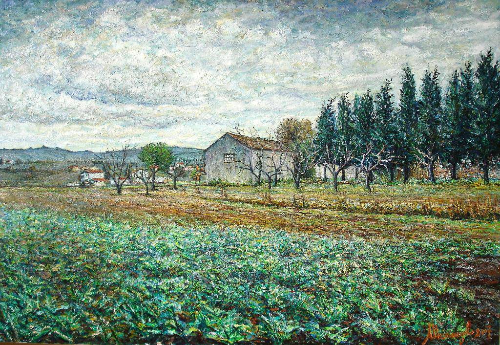 Na obrazie widzimy spokojną, wiejską scenerię pełną naturalnego uroku i harmonii. Dominują tu różne odcienie zieleni, od intensywnej trawy po subtelne kolory drzew. W centrum kompozycji znajduje się stara, szara stodoła otoczona rzędem smukłych drzew, które zdają się szeptać w rytmicznym tańcu wiatru. Taki widok wprawia w nostalgiczną atmosferę spokoju. Obraz emanuje poczuciem ciszy, jakby czas zatrzymał się na chwilę. Artysta używa techniki impasto, dzięki czemu faktura farby jest wyraźna i namacalna, co nadaje dziełu unikalny charakter. Szczegóły krajobrazu są oddane z precyzją, a jednocześnie mają w sobie coś nieuchwytnego, jakby uchwycone w przelotnej chwili. To przypomina, że każda chwila jest "unique". Krajobraz przywołuje ciepłe wspomnienia lata, gdy słońce kołysze się na horyzoncie, a dzieci biegają po polach. "Ale fajne drzewka!" – powiedziałby maluch. Patrząc na to dzieło, można poczuć lekkie ukłucie tęsknoty za prostym życiem, za chwilami wytchnienia. Mnie osobiście przypomina zapach świeżo skoszonej trawy i długie letnie dni spędzane na wsi. Dzieło to jest hołdem dla piękna przyrody, w którym artysta z wprawą łączy różne techniki, by stworzyć dzieło niemal żywe, pulsujące emocjami i ciepłem.