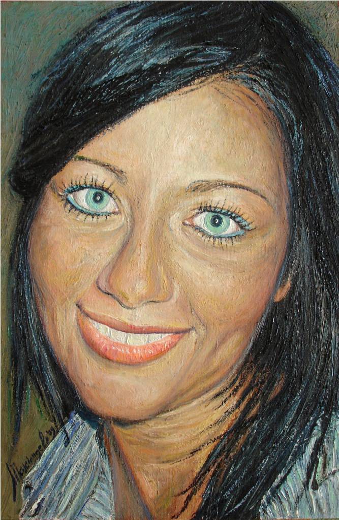 Obraz przedstawia portret kobiety o hipnotyzujących, jasnoniebieskich oczach, które zdają się spojrzeć wprost na widza. Kolory są intensywne, dominują tu ciepłe odcienie skóry, przeplatane delikatnymi akcentami chłodnych, szaro-niebieskich tonów włosów. Artysta zastosował technikę impasto, co dodaje pracy fakturę i głębię, sprawiając, że obraz niemal "żyje". Kompozycja jest centralna, z naciskiem na twarz, co podkreśla jej ekspresyjność. Atmosfera obrazu jest przyjazna i serdeczna. Uśmiech kobiety promieniuje ciepłem i optymizmem, a całość emanuje spokojem i radością. Czujesz, że ona jest twoim przyjacielem w tej chwili. Styl artystyczny przypomina nieco współczesne portrety wykonane w oleju, balansując między realizmem a impresjonizmem. To jest naprawdę cool. Dzieło może wywołać u odbiorcy uczucie bliskości i szczęścia, podobne do tych, które towarzyszą chwilom spędzanym z bliskimi. A może gdzieś w tle czujesz nostalgiczną nutę. Jak mówiłby mały dzieciak: "Ona wygląda miła i wesoła". Na moim nosie widzę te same piegi, więc od razu czuję więź. Emocje płynące z obrazu sprawiają, że trudno oderwać od niego wzrok, a detale wciągają i zachęcają do dłuższego kontemplowania tego artystycznego dzieła.