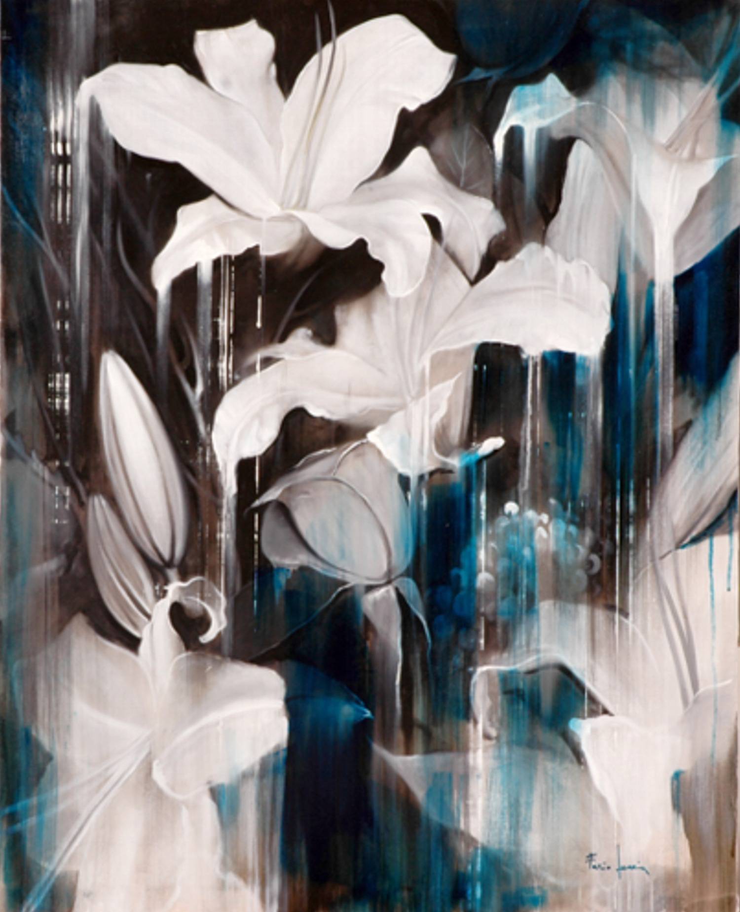 Na obrazie dominują zachwycające białe kwiaty, które wyróżniają się na tle ciemnych, prawie czarnych odcieni. Te delikatne płatki, jakby tańczące na płótnie, przenikają się z subtelnymi akcentami turkusowego i niebieskiego, co nadaje całości nutę tajemnicy. Kwiaty są ulokowane w centrum kompozycji, sprawiając, że od razu przyciągają wzrok odbiorcy. Technika impresyjnej akwareli, którą posłużył się artysta, daje wrażenie płynności i spontaniczności, a lekko rozmyte kontury sugerują ulotność chwili. Atmosfera obrazu jest pełna spokoju i melancholii. Jest trochę jak sen, w którym czas się zatrzymuje. W pewnym sensie to prawdziwy chillout dla oczu. Nastrój wzbudza refleksję i zachęca do chwilowego oderwania się od rzeczywistości. Techniką, jaką posłużył się twórca, jest z pewnością gra światłem i cieniem, przez co obraz nabiera trójwymiarowości. Kiedy na niego patrzę, czuję się jakbym unosił się w świecie czystego piękna. Przywodzi mi na myśl wiosnę, choć widzę tu i tajemnicę, która mówi: "hej, zgadnij, co kryje się w głąb". Dla jednego dziecka obraz może przypominać bajkową łąkę, innym zaś, w tym mi, daje poczucie harmonii i spokoju. Te białe kwiaty są magiczne. Niczym whisper of nature, przenoszą w inny wymiar.