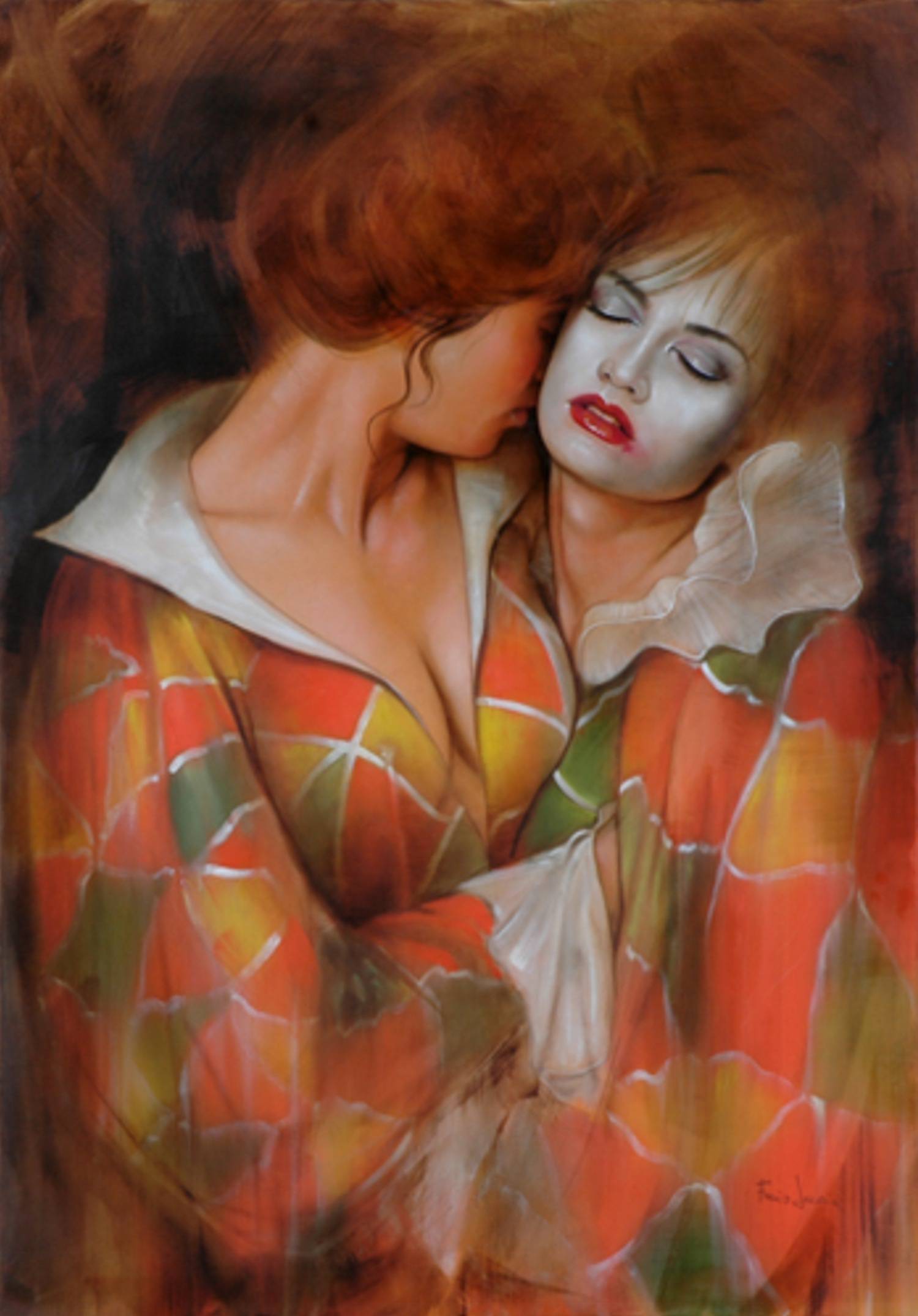 Obraz przedstawia dwie postacie splecione w intymnym uścisku. Dominują ciepłe kolory — odcienie brązów, pomarańczy i czerwieni. Kompozycja skupia się na ich bliskości, otulając wszystko wokół subtelną mgiełką barw. Nastrój jest zdecydowanie nostalgiczny, wręcz tajemniczy, emanujący spokojem i melancholią. Artysta zastosował technikę miękkich przejść tonalnych, co dodaje głębi emocjom i wzmacnia delikatną aurę obrazu. Styl malarski jest nieco impresjonistyczny, z fakturą przypominającą lekko rozwiane pociągnięcia pędzla. Może wywołać u odbiorcy uczucie nostalgii czy refleksji nad utraconą chwilą bliskości. Każdy detal, jakby muśnięty światłem, podkreśla subtelność tego momentu. Dla 7-latka obraz może wyglądać jak scena z bajki, gdzie ludzie się przytulają bo są bardzo szczęśliwi. Personalnie, wzbudza we mnie pewne warm feelings, przypominając, jak ważna jest bliskość i zaufanie. Ten obraz to jak szept, który niesie za sobą historie, które każdy z nas może poczuć na swój sposób.