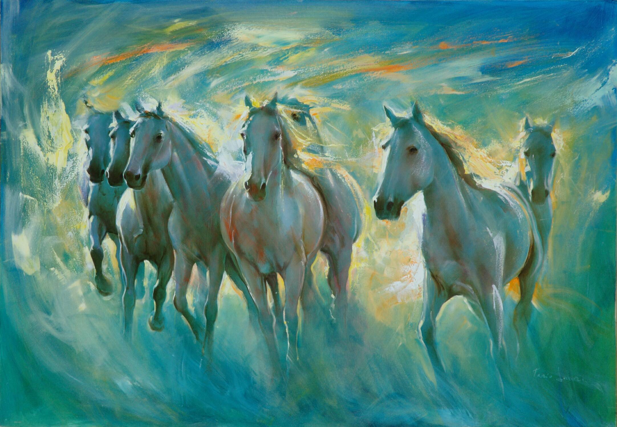 Obraz, który widzimy, przedstawia galopujące konie, z których każda zdaje się pędzić jak wiatr. Dominującymi kolorami na płótnie są odcienie błękitu i zieleni, które płynnie przechodzą przez siebie, tworząc dynamiczną, niemal burzliwą atmosferę. Konie wyglądają na zamglone, jakby były zaledwie krok od bycia marzeniami. Światło gra tutaj istotną rolę, dodając blasku i energii scenie. Rozkład kompozycyjny nadaje dziełu dynamizm. Konie są usytuowane centralnie, co przyciąga wzrok i kieruje uwagę widza ku przodowi obrazu, podkreślając ruch. Nastrój to czysta wolność, to jakby te konie biegły bez końca, uciekając od wszystkiego, co je ogranicza. Styl artystyczny jest luźny i ekspresyjny. Artysta użył technik, które tworzą iluzję ruchu i prędkości. Widać tu wyraźne pociągnięcia pędzla, lekkie, acz precyzyjne. To nadaje obrazowi nieco mistycznego charakteru. Obraz ten może wzbudzać wiele emocji. Wow, ale te konie szybko biegną! Radość, wolność, ale też odrobina tęsknoty za tym, co nieuchwytne. Każdy, kto na niego spojrzy, poczuje, jak wiatr szumi we włosach. A dynamiczna kompozycja wciąga nas do świata, gdzie słowo "freedom" nabiera nowego znaczenia. Ten obraz naprawdę zachwyca i inspiruje.