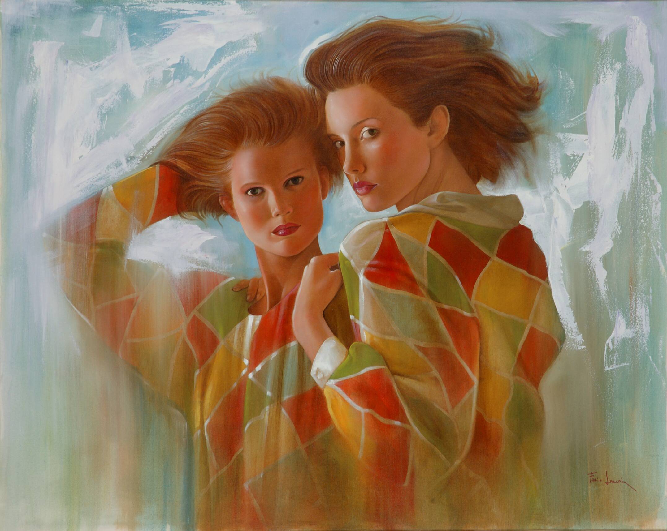 Obraz, który mamy przed sobą, to prawdziwe play of colors. Dwóch kobiet patrzy na siebie z bliska, a całość otulona jest ciepłymi barwami pomarańczu, czerwieni i zieleni. Ubrania w geometryczne wzory przyciągają wzrok, ich intensywność. Kolorystyczna kompozycja tworzy wrażenie dynamiki, a tło w odcieniach błękitu i bieli wprowadza spokój, jakby uspokajało całą scenę. Atmosfera tego dzieła wydaje się być pełna tajemnicy. Jest coś niezwykłego w ich spojrzeniu, jakby skrywały jakiś secret, do którego nie mamy dostępu. Styl artystyczny łączy realizm z czymś trochę ulotnym, jakby artysta bawił się światłem i cieniem, by nadać twarzom głębię i emocjonalną subtelność. Odbiorca może poczuć ciekawość i lekką niepewność. Kim są te postacie? Może przychodzić na myśl refleksja nad naszym własnym odbiciem czy relacjami. Dzieło z łatwością prowokuje do snucia opowieści. Jeden z moich ulubionych momentów to ruch włosów kobiet, jakby wiatr mimo wszystko znalazł drogę do zamkniętego pomieszczenia. Patrząc na ten obraz, czuję lekkie poruszenie. Malarska technika jest mistrzowska, z wyraźnym pociągnięciem pędzla i miękkością w przejściach kolorów. Dzieciak powiedziałby pewnie: "Ale mają fajne koszule!". Ten obraz jest jak tajemniczy list, który chce się otworzyć, by zobaczyć, co kryje się w środku.