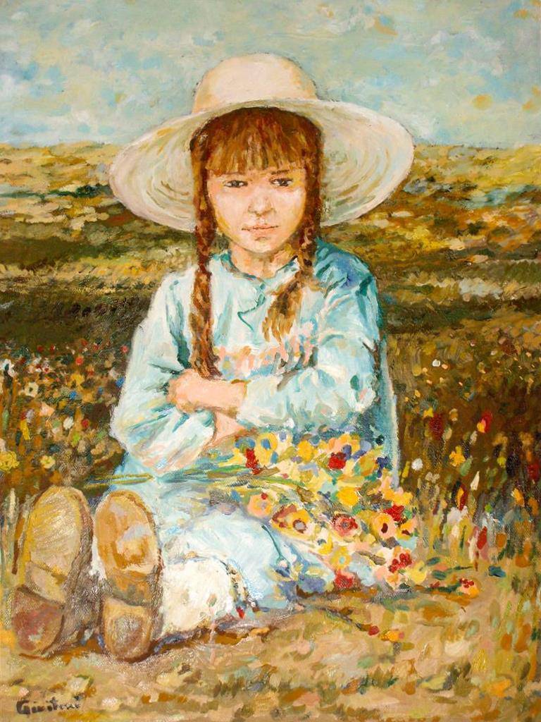 Obraz przedstawia młodą dziewczynkę, siedzącą na tle malowniczych pól pełnych kwiatów. Dominuje tu delikatna paleta kolorów: błękity, zielenie i ciepłe odcienie żółci. Dziewczynka ubrana w jasną sukienkę z przewiązanym warkoczami, wygląda uroczo w dużym kapeluszu, który dodaje jej dziewczęcego charme. Atmosfera obrazu jest sielankowa, emanuje spokojem i beztroską chwilą w letnim dniu. Artysta posłużył się techniką impasto, co dodaje głębi i tekstury, sprawiając że całość wygląda jakby unoszona przez letni breeze. Patrząc na ten obraz, człowiek czuje nostalgiczną tęsknotę za dzieciństwem. Artystyczne wykonanie przywołuje wspomnienia wakacyjnych dni spędzonych na wsi, pełnych ciepła i zapachu kwiatów. Obraz może wywoływać emocje związane z poczuciem bezpieczeństwa i radości z małych rzeczy. Dziewczynka myśli: "Kiedy urośnie, chce być księżniczką!" Dzieło jest urzekające w swojej prostocie i jednocześnie bogate w detale. Światło, cienie i kolorystyczne akcenty prowadzą wzrok po całej kompozycji, zanurzając odbiorcę w sielskim krajobrazie. Może kogoś ten obraz zainspiruje, by poszukać własnych, małych magicznych momentów w codziennym świecie. Wow, work of art!