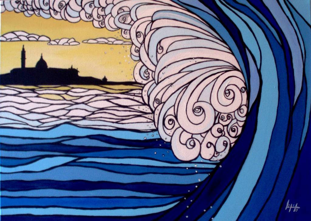 Obraz przedstawia dynamiczne starcie żywiołów, gdzie wielka fala z impetem zamierza uderzyć w spokojne wybrzeże. Dominują tu odcienie błękitu i granatu, które kontrastują z pastelowym niebem rozświetlonym żółtym blaskiem. To daje wrażenie, że dzień powoli przechodzi w wieczór. Kompozycja fali zawiera w sobie kręcone wzory, przypominające wiry i spirale. Czuć, że patrzymy na coś niezwykle potężnego. Ta fala to prawie jak wielka rzeźba, zbudowana z setek niezliczonych pociągnięć pędzla. Atmosfera obrazu to mieszanina spokoju i napięcia. Czuć harmonię, ale i nieuchronność nadchodzącej zmiany. Styl artystyczny przypomina nieco art nouveau. Linie są płynne i nierzadko zamknięte w obrębie przedstawionych form. Technika jest precyzyjna, ale też pełna życia, jakby obraz mógł ożyć w każdej chwili. Emocje związane z tym dziełem mogą być różne. Może ktoś poczuje podziw dla potęgi natury, inny zaś delikatny dreszcz niepokoju. Patrząc na ten obraz, zdaje się słyszeć szum morza. Dla mnie osobiście, to trochę jak ocean’s roar, który uspokaja i równocześnie fascynuje swoją siłą. Wyobrażam sobie także dźwięk fali, który rozbrzmiewa echem w głowie jak melodia. A widok odległej sylwetki na horyzoncie dodaje tajemnicy. Ej, ta fala jest ogromna! Wykrzyknęłoby pewnie dziecko. I miałoby rację. To jest taki obraz, który zatrzymuje widza na dłużej, zmuszając do chwili refleksji.