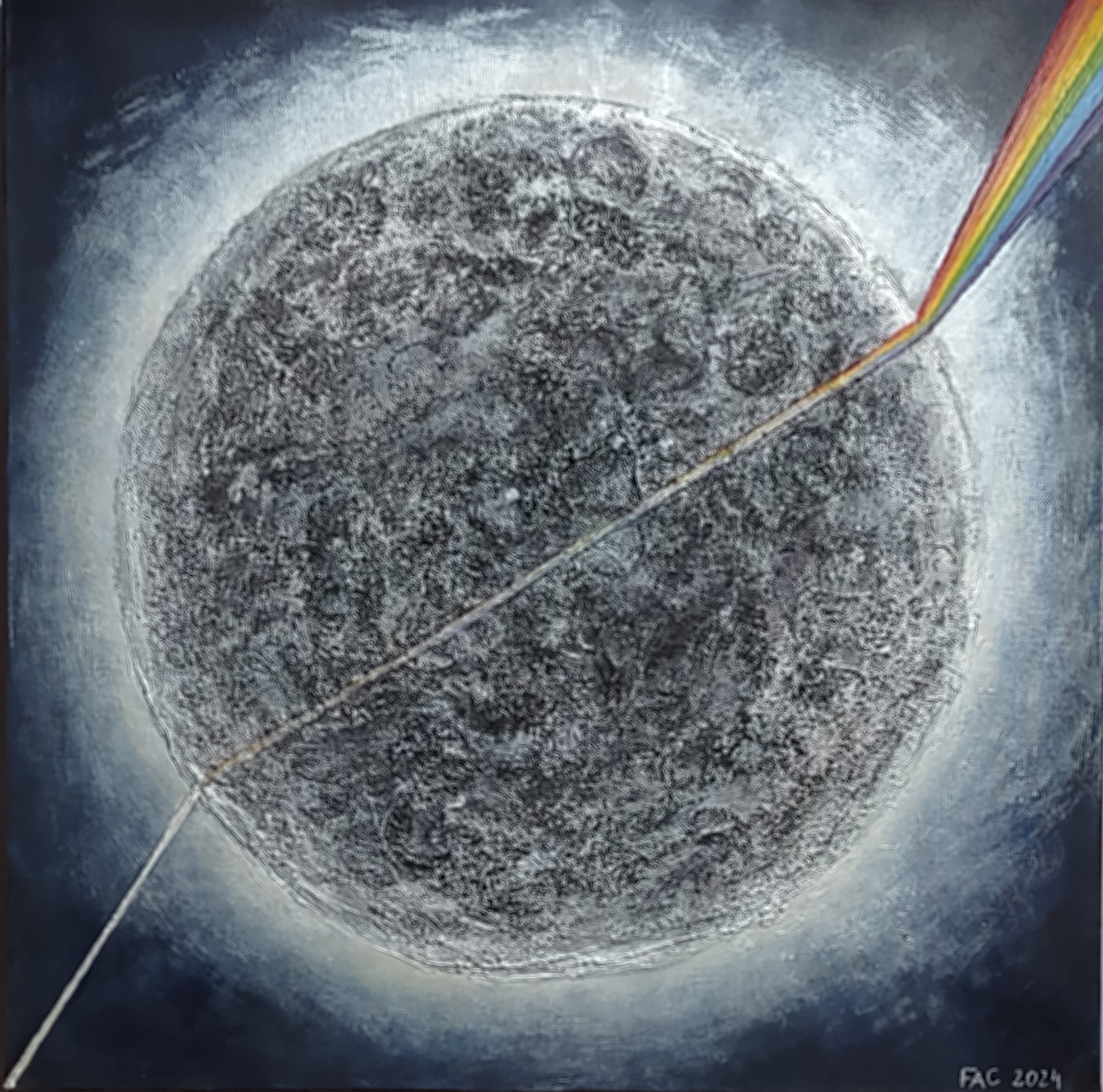 Na obrazie dominuje ciemna, niemal kosmiczna paleta z nutą tajemniczości. Centralnym elementem jest ogromne, szare koło przypominające księżyc lub planetę, z teksturą przyciągającą wzrok ku swojej skomplikowanej powierzchni. W prawej części obrazu pojawia się jasny promień światła, który eksploduje kolorami tęczy. To jak w bajce o przygodach w kosmosie, gdzie wszystko jest możliwe! Kompozycja tworzy dynamiczny kontrast między spokojem a energią, co może budzić mieszankę zachwytu i refleksji. Artysta posłużył się wyrazistym reliefem, co nadaje dziełu trójwymiarowy charakter. Technika przypomina impasto, gdzie farba jest grubiej nałożona, co podkreśla detale. Obraz wywołuje emocje zmienności i harmonii, ukazując, jak w ciemności można odnaleźć piękno. Dla mnie to trochę jak "magic". Jakby ktoś złapał kawałek wszechświata na płótnie. To wizualna symfonia, mieszanka surowości i kolorowego przebudzenia, która sprawia, że zatrzymujesz się na chwilę i myślisz o nieskończoności.