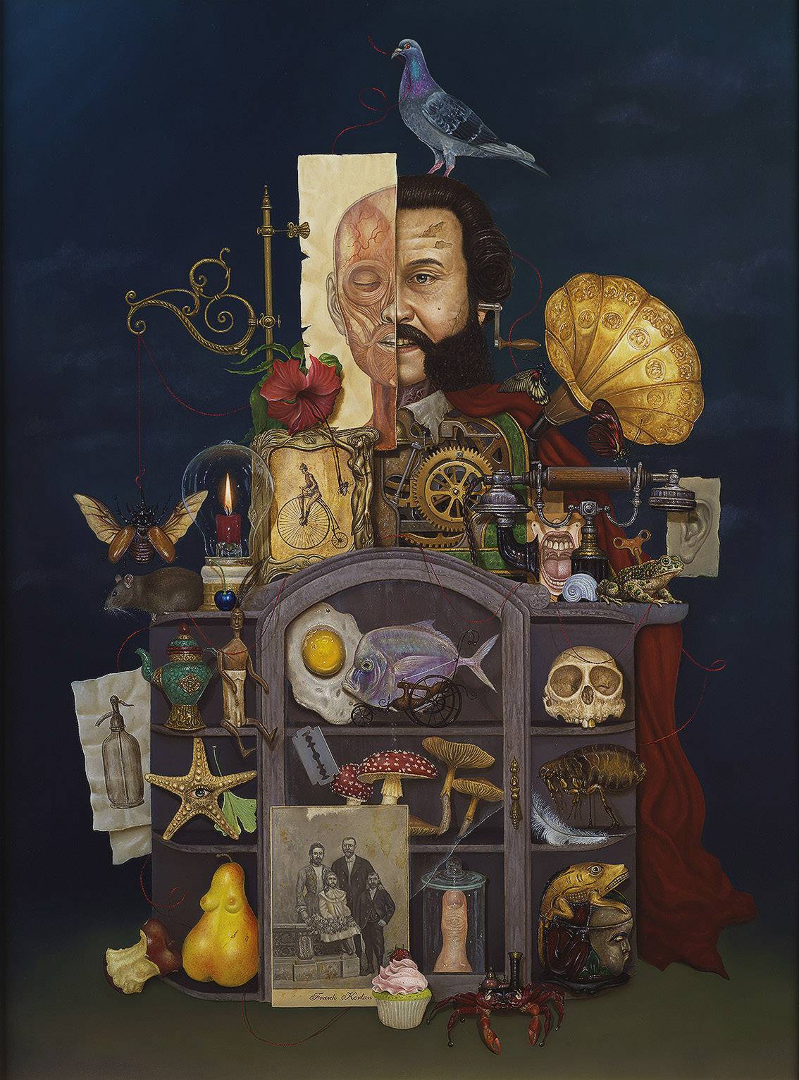 Obraz jest jak ekscentryczny kram pełen dziwności i cudów. Na samym środku widzimy tajemniczą postać z wąsem, otoczoną dziwnymi, surrealistycznymi elementami. Wszystko jest po coś, ale nie wiadomo dlaczego. Przepiękne kolory – ciepłe złote, głębokie błękity – tworzą harmonijną melodię wizualną. Mamy tu starannie narysowane przedmioty codzienne, jak filiżanka, ale i rzeczy nie z tej ziemi, jak fragment czaszki. Sztuka ta jest pełna drobnych detali, jak w kolażu vintage. Atmosfera? Zagadkowa i nieco nostalgiczna jak stare fotografie. Artysta używa technik realistycznych z surrealistycznym twistem, tworząc coś magicznego z rzeczy zwyczajnych. Widz może poczuć się jak odkrywca tajemnic lub jak dziecko zgubił się w sklepie z zabawkami – tak wiele do zobaczenia, cannot decide where to look. Może to być przypomnienie o ulotnym pięknie codzienności lub alegoria poszukiwania sensu w chaotycznym świecie. "O patrz, jajko i rybka razem na półce!" - powiedziałoby 7-letnie dziecko. Ten obraz zaprasza do podróży po własnych wspomnieniach, otwierając drzwi do nieznanych światów. Fascynujący i inspirujący!