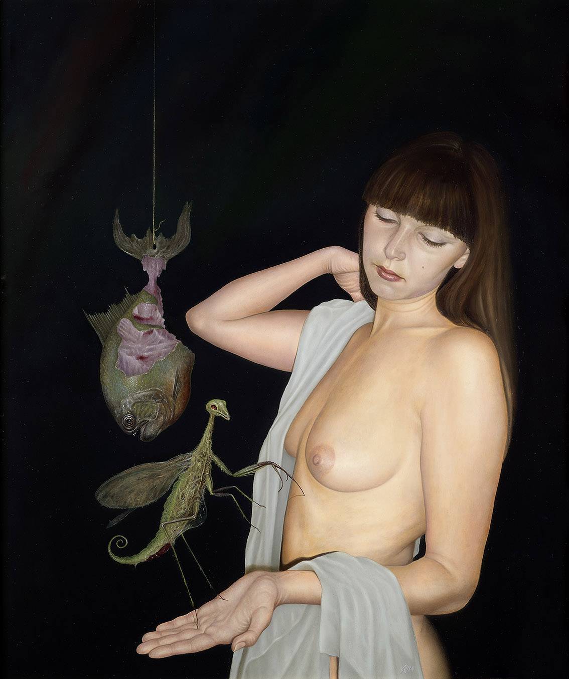 To obraz o niezwykłej kompozycji, gdzie postacie przechylone są w stronę świata surrealizmu. Ciemne tło przyciąga uwagę do jasnych tonów skóry, a nagie ramiona kobiety kontrastują z delikatnym materiałem spływającym z jej ciała. Na jej dłoni spoczywa stwór przypominający modliszkę, zielony i pełen detali, a po lewej wisi ryba o otwartym brzuchu. Atmosfera dzieła jest trochę niepokojąca, jakby czas zatrzymał się na chwile. Artysta użył starannych detali, dodając realistyczne cienie i subtelnie wkomponowane elementy, które sprawiają, że obraz wydaje się niemal fotorealistyczny. Chociaż technika jest precyzyjna, całość buduje niezwykły nastrój tajemniczości. Obraz może budzić w widzu mieszane uczucia - z jednej strony zachwyt nad precyzją, z drugiej pewien niepokój. Coś jak dream, który trudno zrozumieć, ale fascynuje. A ona ma zamknięte oczy, może śni o czymś pięknym. Ten obraz mnie intryguje, daje do myślenia, może trochę dziwi. Jest jak tajemnicza opowieść, której koniec każdy może wymyślić sam.