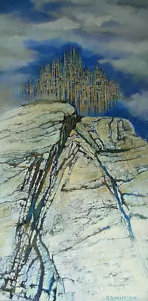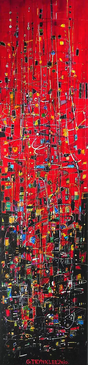 Obraz, podzielony na cztery poziome pasy, prezentuje różnorodne pejzaże w intrygującej sekwencji. Górna część ukazuje piaszczyste, pustynne wydmy w odcieniach delikatnych beżów i złota. Środkowa warstwa to abstrakcyjne, niebeskie formy, przypominające migoczące gwiazdy na nocnym niebie. Jakieś maleńkie kropki, trochę chaosu. Dalej, spokój rozlewa się w formie zmierzającego ku morzu horyzontu, gdzie woda i niebo zlewają się w chłodnych szarościach. Czwarty pas, najniżej, pokazuje drewniane pale wbijające się w potężne, wzburzone fale – niemal czuć ich siłę. Mój brat by powiedział, że to takie "coś co jest nad morzem". Technika, którą artysta zastosował, to miks akrylu i delikatnych pociągnięć pędzla, co nadaje każdej scenie unikalny charakter. Widz nie może się oprzeć poczuciu nostalgii lub nawet niespokojnego piękna – "chaos and calm" zawarte w jednym obrazie. Coś w rodzaju podróży w czasie i przestrzeni. Każdy segment wciąga w osobny świat, a każdy kadr wywołuje własny zestaw emocji. Myślę, że G. Trynkler stworzył coś wyjątkowego w 2017.