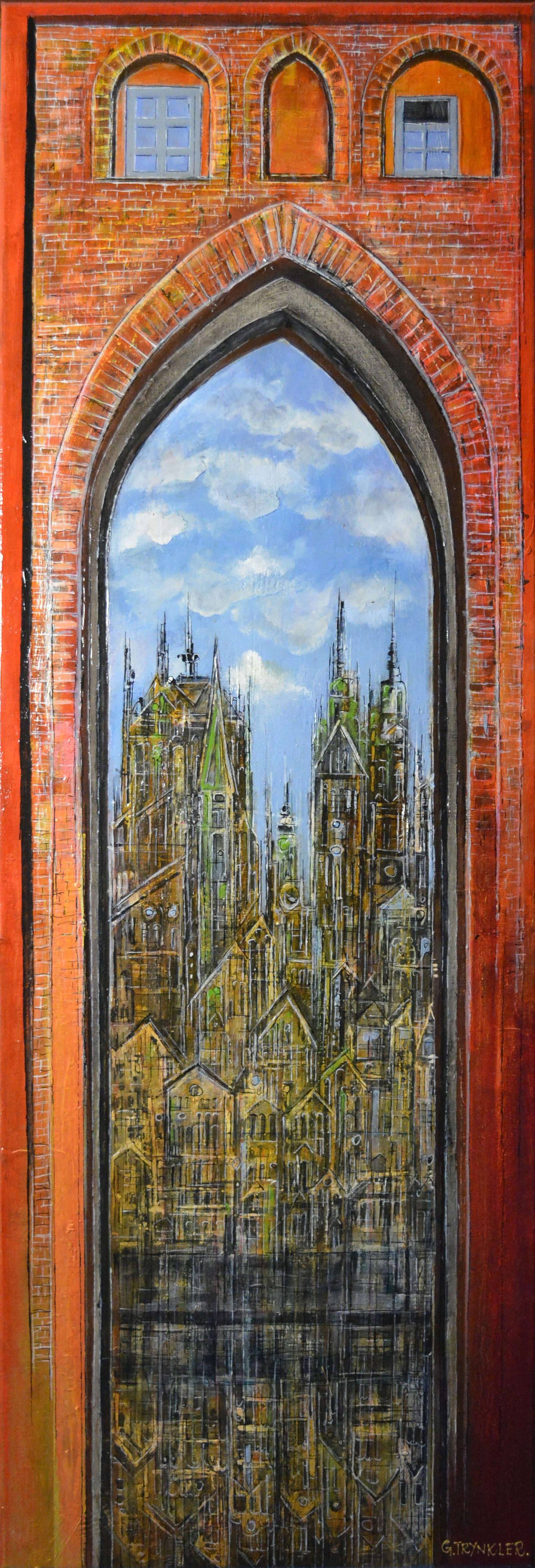 Obraz ukazuje imponujące miasto widziane przez okno o gotyckim łuku. Dominuje w nim wspaniała mieszanina ciepłych czerwieni i chłodnych, niebieskich odcieni. Architektura przypomina misterne, średniowieczne budowle z licznymi wieżyczkami, które sięgają nieba. Chmury płynące nad miastem dodają lekkości całej scenerii. Ogólny nastrój obrazu jest nostalgiczny, jakbyśmy patrzyli przez portal czasu. Styl dzieła to mix realizmu i abstrakcji. Techniki, takie jak długie, precyzyjne pociągnięcia pędzla oraz wyraźne linie, tworzą strukturę miasta, które wydaje się prawdziwe, a jednocześnie magiczne. Artysta zastosował intrygującą grę światłem i cieniem, co sprawia, że całość żyje, migocze i przyciąga wzrok. Kiedy patrzę na to miasto, czuję, jakby zapraszało mnie do odkrycia swoich tajemnic. Budzi się tęsknota za miejscami, które jeszcze nie istnieją. Wow, jak bym tam chciał być! Może to właśnie window to the past? Kompozycja obrazu, z motywem odbicia, przypomina nam o złożoności wspomnień i marzeń. W tle słychać ciche szepty historii zaklętej w kamieniu.