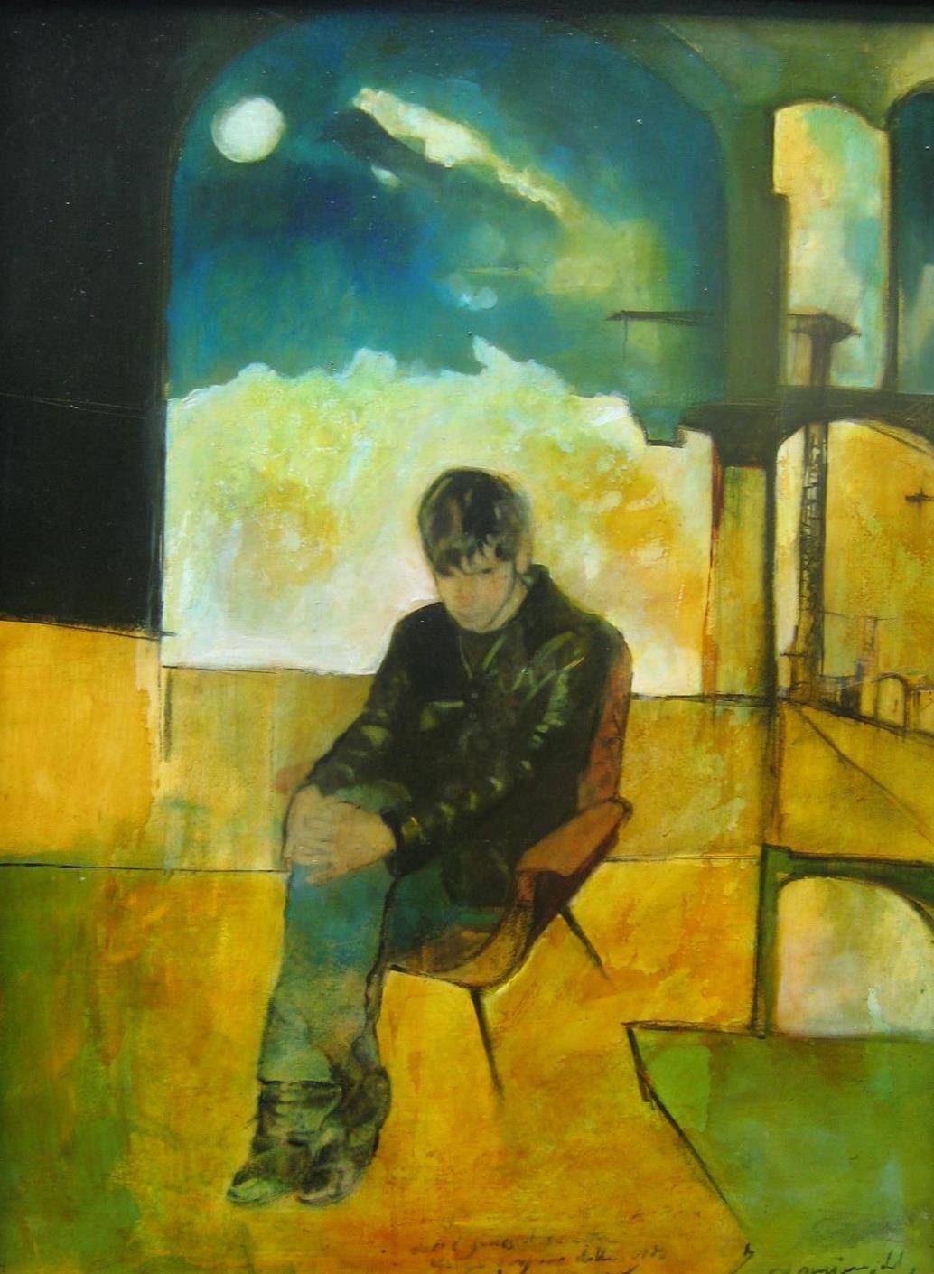 Na obrazie widzimy młodego chłopca siedzącego na krześle. Kolory są żywe, dominują złociste i zielone odcienie, które stworzą ciepły kontrast z chłodnym błękitem nieba i bielą chmur w tle. Scena wydaje się jakby zamglona, dodając całości nuty tajemniczości. Kompozycja jest intrygująca, postać znajduje się w centralnej części obrazu, co przyciąga wzrok i skupia uwagę na jego melancholijnej postawie. Artysta posłużył się techniką mieszanych mediów, łącząc subtelne pociągnięcia pędzla z teksturalnymi detalem. Myślę, że chciał uchwycić delikatność chwil, które przemijają. Widz może poczuć spokój, ale też pewne napięcie – jakby chłopiec nosił w sobie historie, które czekają na opowiedzenie. Obraz sprawia, że czujemy się jak w magic kind of place, gdzie rzeczywistość miesza się ze snem. Patrząc na twarz chłopca, można się zastanowić, o czym myśli i co ukrywa jego smutek. Wprowadza to widza w refleksyjny, niemal kontemplacyjny nastrój. A może chce się po prostu usiąść obok i posłuchać opowieści, którą ma do opowiedzenia, razem podziwiając niecodzienny, lecz urzekający świat przedstawiony na tym płótnie.