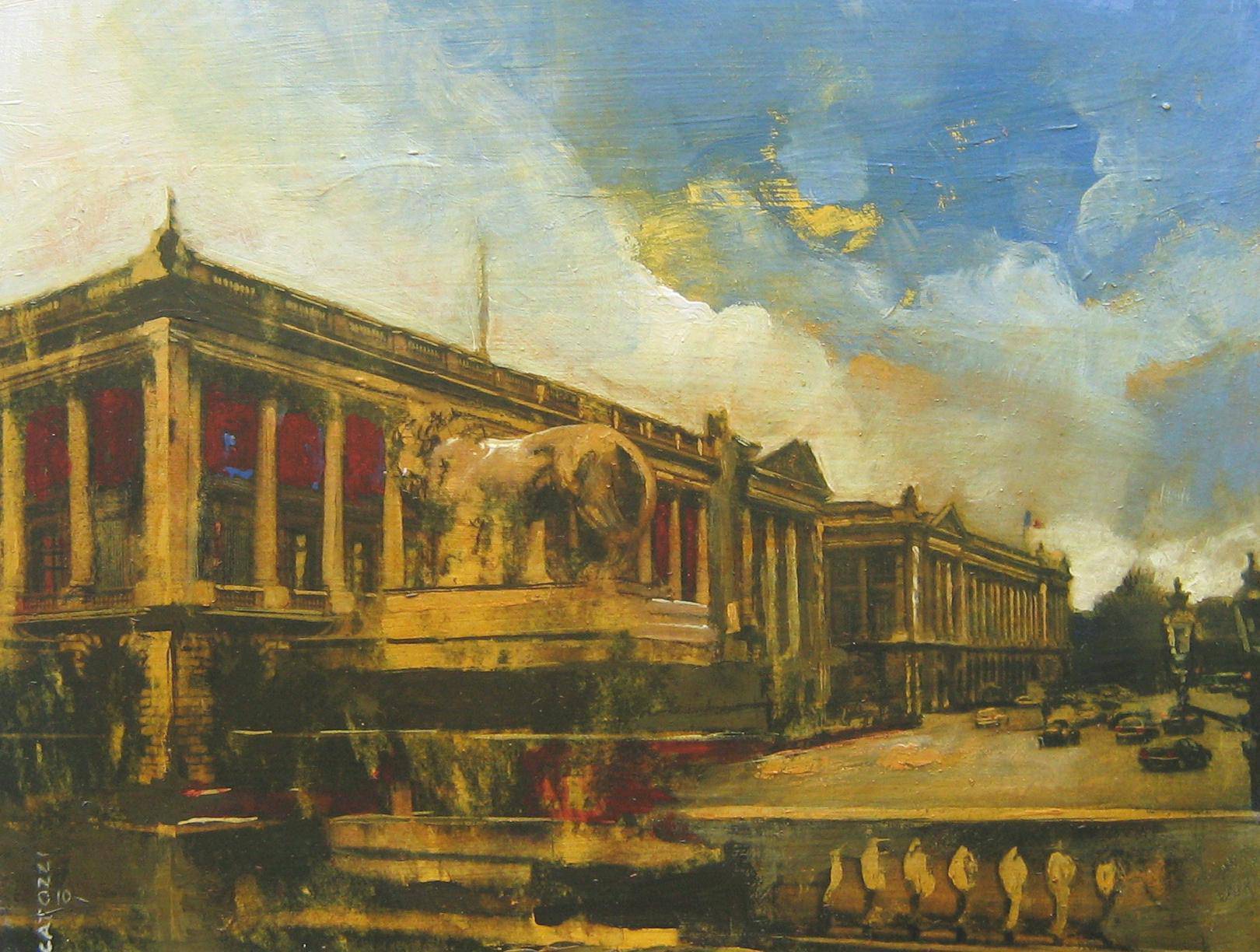 Obraz przedstawia monumentalną budowlę, której imponujące kolumny wznoszą się dumnie ku niebu. Główną paletę kolorów stanowią przygaszone odcienie brązu i złota, które nadają scenie staroświeckiego uroku. Na pierwszym planie widoczna jest rzeźba słonia, dodająca swoistego charakteru całej kompozycji. W oddali widać samochody, które przypominają o tętniącej życiem metropolii. Atmosfera dzieła jest nieco nostalgiczna, jakby czas się zatrzymał na chwilkę. Malarz zastosował technikę impasto, co nadaje teksturze dodatkowej głębi i wyrazistości. To jak podróż do innego świata, czasem myślę, że takie obrazy mają własne życie. Styl artysty może być postrzegany jako połączenie realizmu z nutą impresjonizmu, gdzie światło i cienie odgrywają kluczową rolę. Emocje, jakie budzi obraz, można opisać jako mieszaninę podziwu i refleksji nad przemijaniem czasu. Myślę, że każdy może tutaj znaleźć coś dla siebie, jakieś small glimmer of hope, albo po prostu chwilowe zatrzymanie pędu życia. Dziecko mogłoby powiedzieć: „O, patrz, tam jest duży słoń!”. Wrażenie ukrytej historii i tajemnicy sprawia, że obraz emanuje magią, która może czasem zaskoczyć. Osobiście jestem zauroczony detalem i tym, jak artysta umiejętnie oddał emocje i tempo miasta, które mimo statyczności dzieła są niemal wyczuwalne.