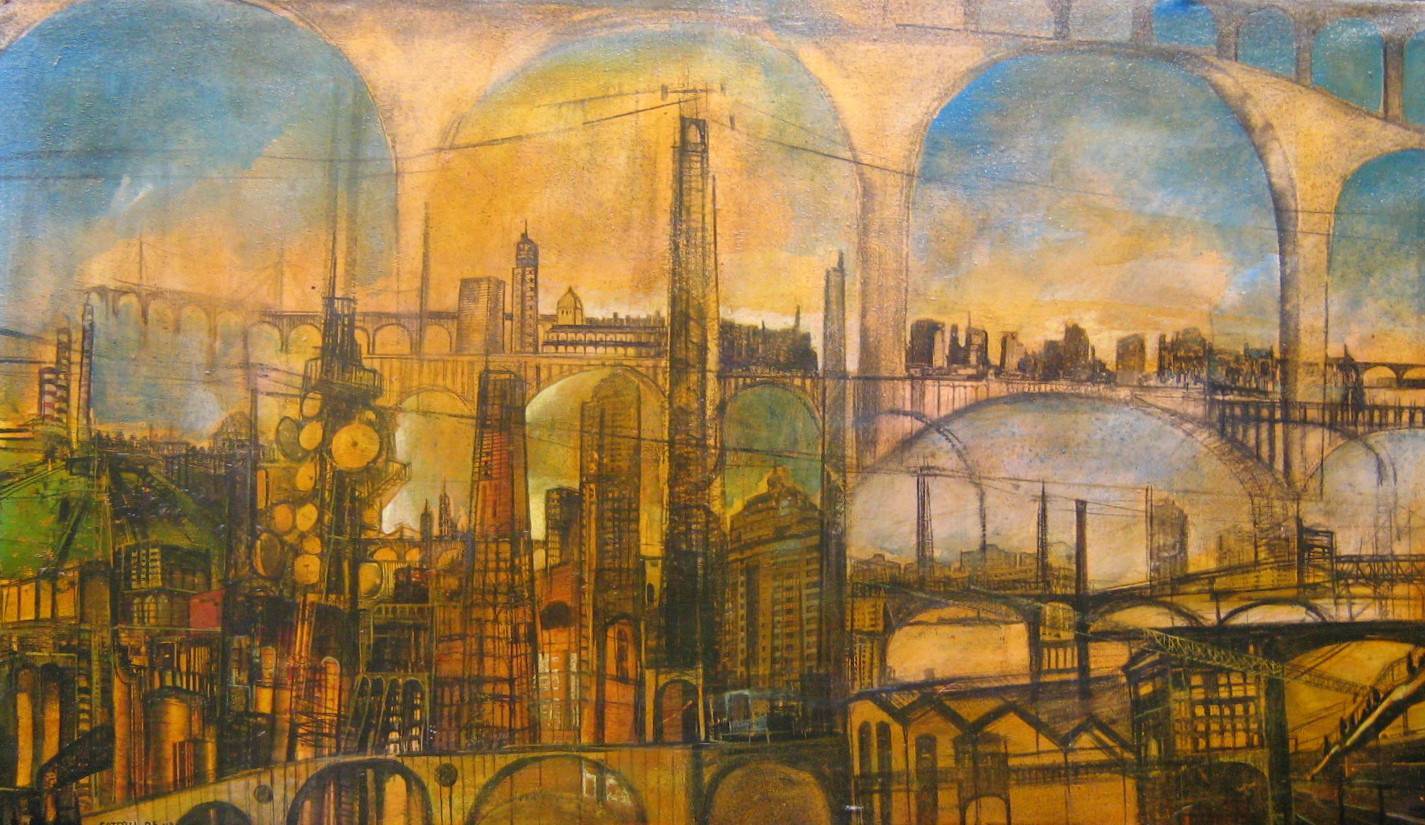 Obraz emanuje złożoną kompozycją pełną miejskich struktur. Dominują na nim odcienie żółci, brązu i zieleni, które tworzą ciepłą, lekko nostalgiczna aurę. Liczne mosty i wieżowce rozciągają się jak labirynt, tworząc wrażenie dynamicznego miasta w ruchu. Artysta użył delikatnych linii i miękkich konturów, co dodaje obrazowi poetyckiego, wręcz marzycielskiego nastroju. Atmosfera miasta, choć zatłoczona, nie jest przytłaczająca, lecz fascynująca i pełna życia. Technika mieszania farb olejnych daje subtelny efekt rozmycia, przywołując na myśl stare fotografie lub kartki pocztowe. Detale architektoniczne są pełne finezji, co świadczy o wprawnym oku artysty. Myślę, że takie miasto mogłoby być domem dla superbohaterów, prawda? Obraz budzi w widzu nostalgię za czasami, kiedy życie miasta było centralnym punktem społeczności. To takie "urban dream" - czasem wręcz surrealistyczne. Patrząc na ten obraz, można poczuć się jak odkrywca wędrujący po zakamarkach metropolii sprzed lat. Czy nie wydaje się, że zaraz zza rogu wyłoni się coś niesamowitego? Każdy zakątek obrazu niesie ze sobą cząstkę historii, przyciągając wzrok do kolejnych zakątków miejskiej dżungli. Choćby się chciało, trudno oderwać od niego oczy.
