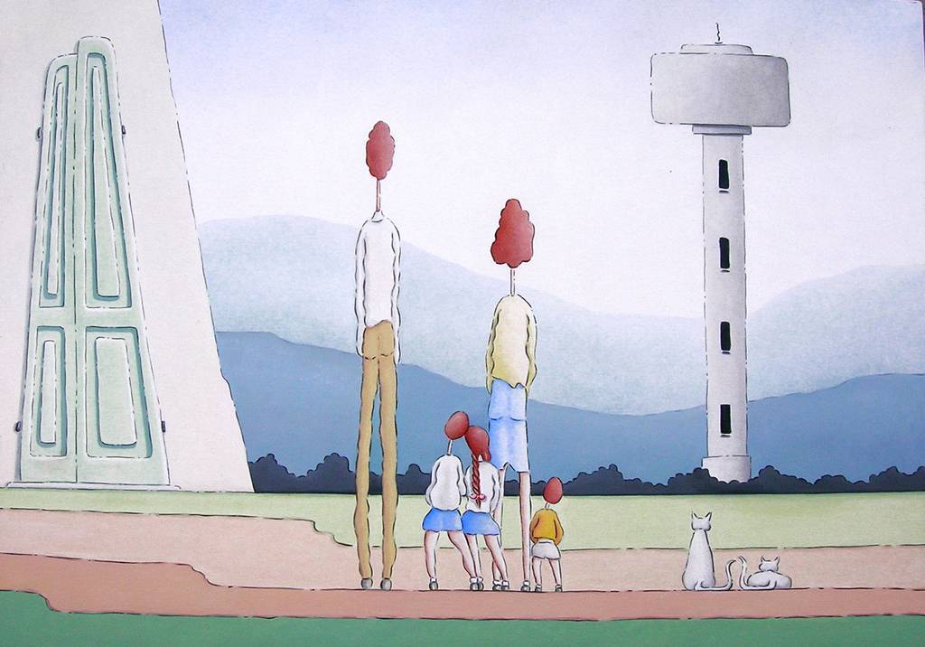 Na obrazie widzimy grupę postaci, które stoją tyłem do widza. Uwagę przyciągają ich wydłużone, nienaturalne kształty, które nadają sylwetkom karykaturalny wygląd. Dominują pastelowe kolory: błękity, zielenie i czerwienie, które tworzą spokojną, niemal marzycielską atmosferę. Krajobraz w tle to spokojne wzgórza i tajemnicza wieża, nadająca scenie odrobinę tajemniczości i modernistycznego klimatu. Może to być takie science fiction. Artystyczna technika jest czysta i minimaliztyczna, z wyraźnymi konturami, które definiują kształty postaci i obiektów. Artysta skupia się na prostocie formy, co dodaje całości pewnej abstrakcyjnej elegancji. Atmosfera obrazu zdaje się być lekko odrealniona, jakby pochodziła ze snu. Widz może czuć się zaintrygowany, ale także spokojny. Taka niewymuszona harmonii wydaje się zachęcać do refleksji nad relacjami międzyludzkimi. To jest takie miejsce, gdzie koty sobie siedzą i patrzą. Obraz może budzić odczucia nostalgii za dzieciństwem albo pytania o przyszłość, jakby postaci obserwowały coś ważnego. Dzieło tchnie ciepłem, ale też pewnym dystansem, jakby zapraszało do wkroczenia w jego magiczny świat.