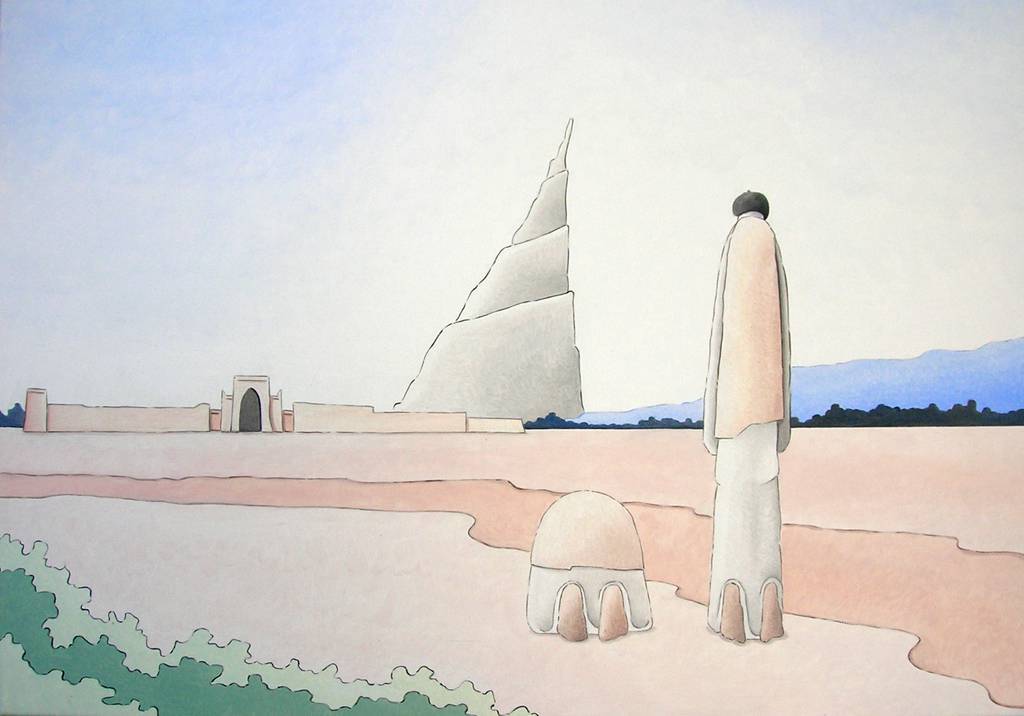 Obraz ten to jakby senna widokówka z innego świata. Dominują tu pastelowe kolory, delikatne beże, błękity nieba i zielenie nakładają się w spokojny sposób. W centrum kompozycji znajduje się monumentalna, ukośna struktura, która przyciąga wzrok i rodzi pytanie "Czym to jest?" – trochę jakby obcy monument. Na pierwszym planie stoją dwie tajemnicze postacie, przypominające figury czy rzeźby, które zdają się obserwować przestrzeń z zadumą. Mogłyby mówić "Jestem głodny" – myśli 7-letnie dziecko, spoglądając na nie. Atmosfera obrazu jest pełna spokoju i ciszy, niemalże słychać jak wiatr delikatnie muska powierzchnię, tworząc nastrojową melancholię. Można poczuć jak czas zwalnia, zatrzymując się na chwilę. Artysta zastosował minimalistyczny styl, z dużą uwagą na formy i proporcje. Technika akwareli dodaje subtelności i łagodności konturom, a odważne linie podkreślają geometryczne kształty. Emocje, jakie wywołuje ten obraz, są przemyślane – odrobinę zagubienie, ale i ciekawość. Czym są te formy? Czy to miejsce istnieje naprawdę, czy jest tylko wytworem wyobraźni? Może to być refleksja nad innością, nieznanym, odkrywaniem nowych przestrzeni. It's intriguing, wzbudzające pragnienie odkrywania i dociekania tego, co nieznane. To dzieło jest jak tajemnica, którą każdy chciałby rozwikłać na swój sposób.