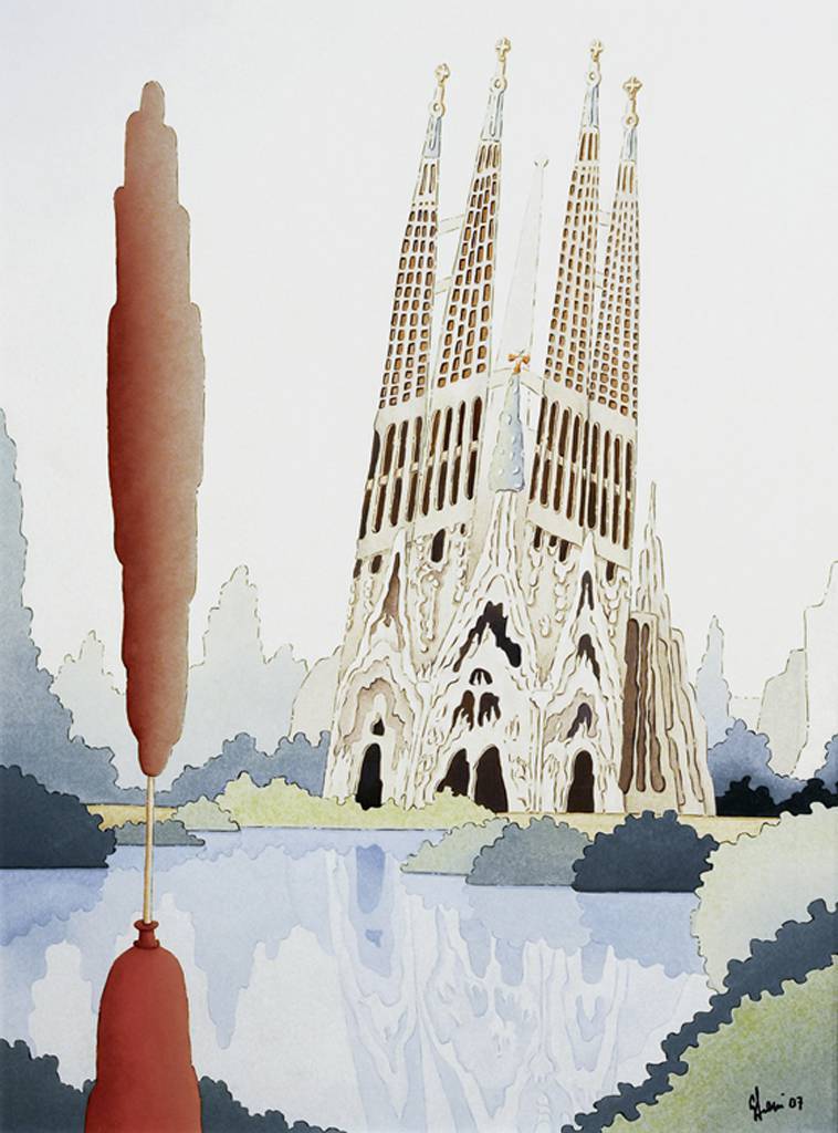 Na obrazie widzimy niezwykłe połączenie architektonicznego majestatu i miękkiego, delikatnego krajobrazu. Dominują jasne barwy: beże, zielenie oraz błękity, które tworzą spokojną, niemalże eteryczną atmosferę. Strzeliste wieże katedry unoszą się ku niebu, przypominając gigantyczne rzeźby wyrzeźbione z piasku. Woda na pierwszym planie odbija całość, dodając kompozycji lekkości i dreamlike quality. Technika akwareli, którą zastosowano, nadaje całemu dziełu zwiewności i subtelności. Kiedy patrzę na ten obraz, czuję spokój. To takie miejsce, gdzie chciałbym się zrelaksować i zapomnieć o codziennych troskach. Mój mały brat powiedziałby, że wieże wyglądają jak gigantyczne ciastka. Artysta celowo zastosował rozmycie konturów, co dodaje tajemniczości i wprowadza pewien rodzaj nostalgii. Jest w tym coś magicznego i jednocześnie swojskiego. Każdy może tu znaleźć coś dla siebie, od dzieci po dorosłych, których zachwyci perfekcyjna harmonia kolorów. Patrząc na ten obraz, zastanawiam się, jakie historie kryje w sobie ta wyjątkowa architektura. Może to było miejsce cudownych wydarzeń? Wprowadza lekkie poczucie melancholii, ale jednocześnie daje nadzieję, że wszystko jest możliwe.