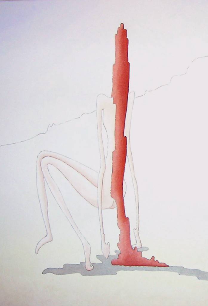 Obraz emanuje minimalistycznym urokiem, mieszając subtelne pastelowe kolory z intensywnym, czerwonym akcentem, który dominuje na pierwszym planie. Białe tło podkreśla kontury postaci, niemal abstrakcyjnej w swojej formie. Kształty są proste, ale nieoczywiste, przypominając figury z dziecięcych rysunków, gdzie wyobraźnia pozwala na nieskończoność interpretacji. Nastrój obrazu jest zaskakująco kojący, choć kontrast intensywnej czerwieni potrafi obudzić w odbiorcy lekkie napięcie. Spokój tego minimalistycznego dzieła jest jednak niekłamany, a każdy z elementów zdaje się być na swoim miejscu. Artysta stosuje delikatne pociągnięcia pędzla, tworząc efekt watercolor, co dodaje obrazowi eteryczności. Patrząc na obraz, można poczuć się jak dziecko, odkrywające nowe światy. "To wygląda jak wieża z długimi nogami!" – mogłoby powiedzieć dziecko, zauważając dziwaczność kształtów. Ten obraz jest jak „mystery” – tajemnica, która zaprasza do jej zgłębienia. Widz może otrzymać bogactwo emocji od subtelnej zadumy, po śmiech z powodu jego surrealistycznej prostoty. A może to po prostu chwilowy chaos, który zaskakująco dobrze komponuje się z naszym własnym wnętrzem. Kto wie, w tym kryje się jego magia.