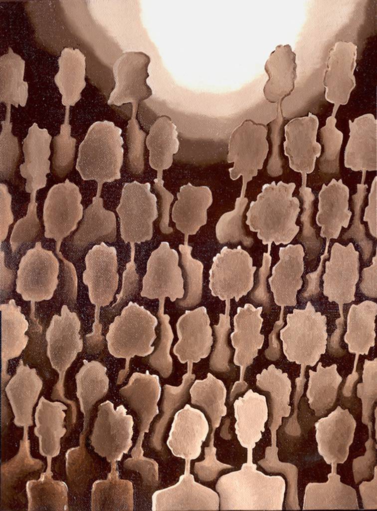 Obraz hipnotyzuje swą prostotą i głębią. W palecie dominuje ciepły brązowy odcień, przechodzący w subtelne cienie. Liczne sylwetki głów unoszą się w stronę jasnego okręgu, bijącego z góry, jakby przyciągała je niewidzialna siła. Elementy są uproszczone, kształty sylwetek wydają się niemalże rzeźbione w powietrzu. Artysta zastosował delikatną grę światła i cienia, która dodaje całej scenie tajemniczości i głębi. Atmosfera obraz jest pełen spokoju, ale też ociera się o coś niepokojącego. Czuję, że coś się tam kryje, coś, czego na pierwszy rzut oka nie da się dostrzec. Całość przypomina dreamy sen, gdzie rzeczywistość miesza się z fikcją. Obraz może wywoływać uczucie fascynacji, ale też pytania o to, kim są te postacie i dokąd zmierzają. Styl pracy jest minimalistyczny, co dodaje dramatyzmu całej kompozycji. Linie są miękkie, jakby namalowane lekką ręką. Technika ta daje wrażenie płynności, choć jednocześnie wydobywa z przestrzeni pewną ciężkość. To jak połączenie prostoty z czymś głębokim, bardzo easy to get lost in. Patrząc na to dzieło, zastanawiam się nad samotnością i wspólnotą zarazem. Może to tłum ludzi na koncercie, a może cieniste dusze wędrujące ku światłu. Dziecko mogłoby powiedzieć: "Oni idą do nieba". Obraz może pozostawić trwałe wrażenie, zachęca do dalszej refleksji.