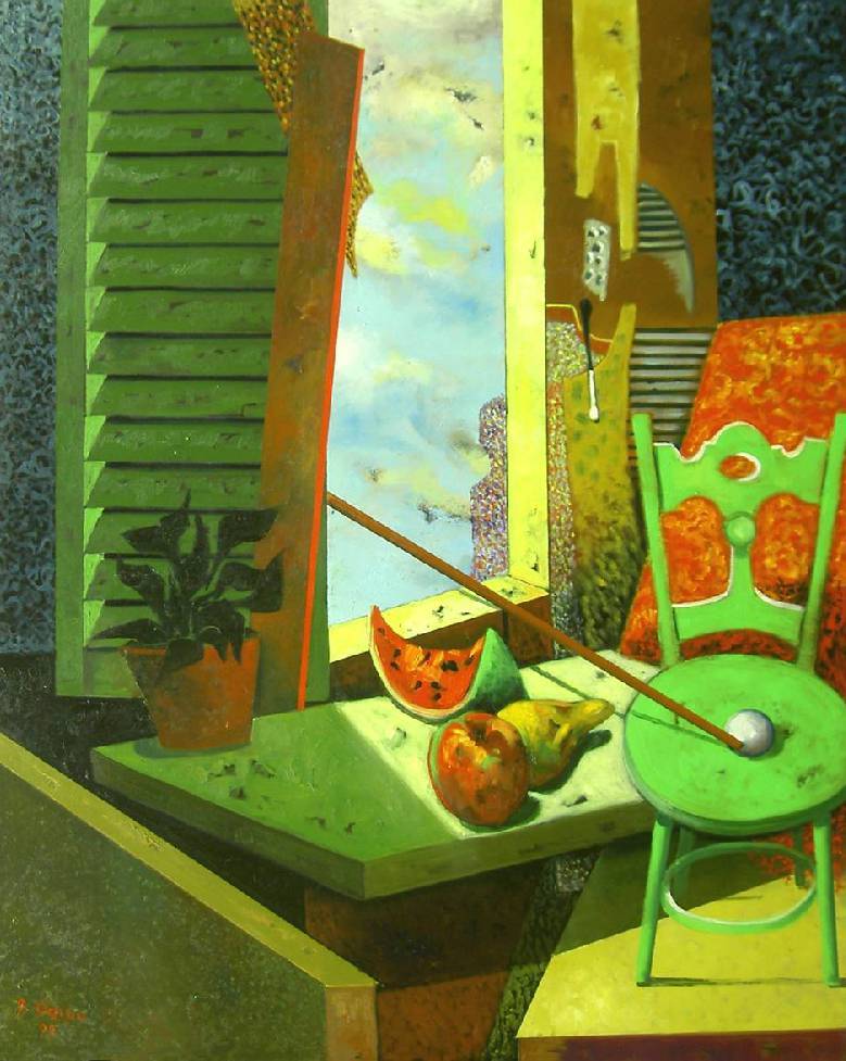 Obraz emanuje kolorami jak tęcza po burzy. Zieleń dominuje, obejmując stół, krzesło i żaluzje, przełamane ciepłymi odcieniami pomarańczowego i żółtego. Kompozycja jest dynamiczna – jakby ktoś uchwycił moment tuż przed. Myślę, że to bezruch pełen ukrytej energii. Styl artysty przypomina nieco surrealizm, gdzie rzeczywistość spotyka się z wyobraźnią. Kiedy patrzę na ten obraz, odczuwam pewną tęsknotę, jakbyśmy za moment mieli wrócić do współczesności z sennych marzeń. Kształty są geometryczne, ale też nieco płynne. Obraz wydaje się krzyczeć "freedom", uwalniając z umysłu spracowane myśli. Jest tu trochę magicznego klimatu. Krzesło przy oknie – co się za nim kryje? Może jakiś sekret, może zwykłe popołudnie. Nie wiem. Melon wygląda soczyście, a patrząc na niego, czuję letni wiatr na twarzy. Dziwacznie, ale tak! To jak spędzanie wakacji u babci – bez zmartwień. A kwiatek w doniczce przypomina mi o czasach, gdy byłem dzieckiem i sadziłem z rodzicami rośliny. Czy to nie jest piękne?