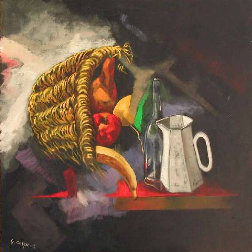 Obraz przedstawia piękną martwą naturę, która tętni kolorami i zaskakuje oryginalnością. Głównym elementem jest kosz pełen owoców: soczystych jabłek, bananów i cytryn, które przyciągają oko swoją intensywnością. Obok, spokojnie spoczywa szklana butelka oraz biała dzbanek o geometrycznym kształcie. Tło, pełne ciemnych, tajemniczych tonów, nadaje całości głębi i lekkości jednocześnie, jakby mgła otaczała ten barwny spektakl. Czujesz, jakby obraz ten opowiadał historię codziennego życia, a jednocześnie... był czymś więcej. Styl artysty przypomina trochę classic cubism, gdzie elementy są stylizowane i formy nieco uproszczone, ale pełne dynamiki. Grubo nakładane pociągnięcia pędzla i nierówne plamy farby tworzą wrażenie ruchu i nieporządku, a może to właśnie ten chaos nadaje mu uroku? Dla mnie, dzieło to emanuje spokojem i nostalgią za przeszłością. Czujesz to ciepło domowego ogniska, smak dzieciństwa. W ciemniejsze dni, kiedy wszystko wydaje się zbyt szybkie, obraz przypomina o wartości małych chwil i prostych rzeczy. Myślę, że wywołuje uśmiech i melancholię jednocześnie. "Ale fajne! Look at that apple!" mogłoby powiedzieć dziecko. Patrząc na to dzieło, czuję nutkę tęsknoty za czasem, gdy życie było prostsze i bardziej kolorowe.