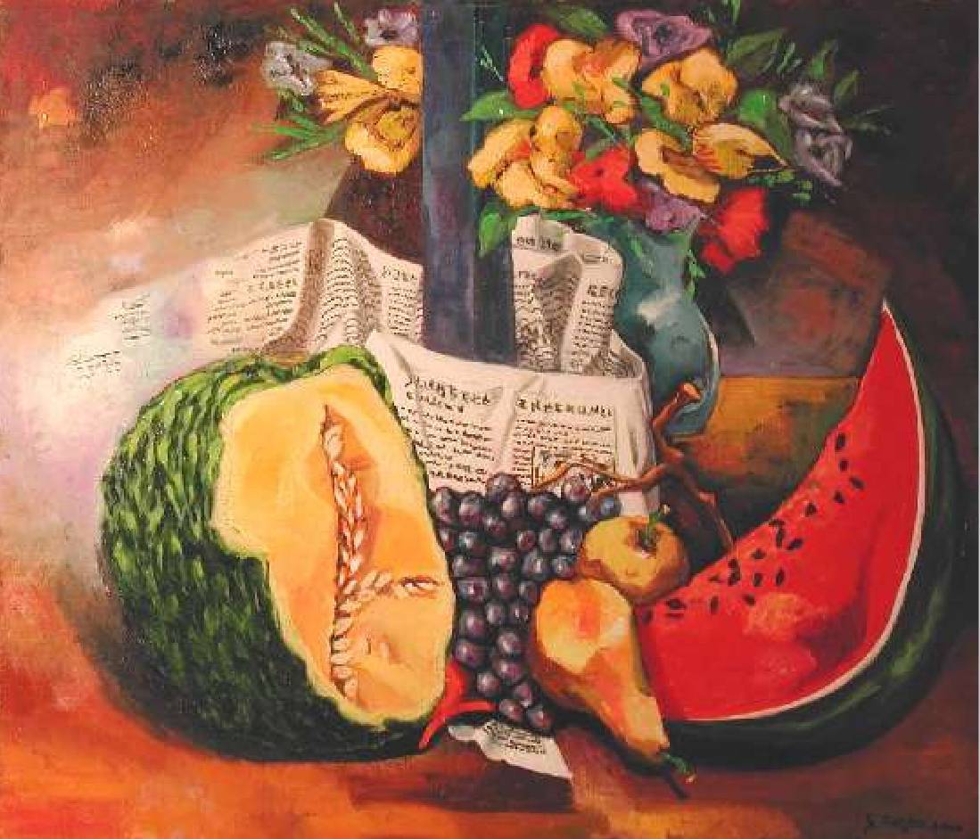 Obraz przyciąga wzrok swoją żywą kolorystyką i pełną detali kompozycją. Na pierwszym planie widzimy apetyczne owoce: soczystego arbuza, intensywnie pomarańczowy melon i ciemne grona winogron. Ich kolory są tak intensywne, że prawie można poczuć ich smak. Kompozycja tętni kontrastami, jakby ktoś przez przypadek wylał wszystkie swoje farby na płótno i z tego chaosu stworzył arcydzieło. W tle widnieje bukiet kwiatów, który dodaje scenie romantycznego uroku. Atmosfera jest ciepła i przytulna, jak w niedzielne popołudnie na wsi. Artystyczna technika jest pełna energii. Użyto prawdopodobnie grubych pociągnięć pędzla, co dodaje obrazowi tekstury i głębi. Artysta umiejętnie łączy styl realistyczny z nutą ekspresji, nadając całości niepowtarzalnego charakteru. Można prawie poczuć lekki powiew wiatru poruszający kartkami gazety w tle. Ten obraz wywołuje emocje ciepłego spokoju, ale i lekkiej nostalgii za beztroskimi dniami. Może przypominać o prostocie życia, podkreślać jego ulotność i piękno codzienności. Dla dziecka to może być "obraz z jaskrawo kolorowymi owocami, które wyglądają jakby można było je zjeść". Jest tu pewien "vibe" domowego komfortu i naturalnej elegancji. Czasem patrząc na takie dzieło, człowiek zastanawia się nad sensem piękna i jak łatwo można je znaleźć w prostych rzeczach. To jak zatrzymać chwilę czasu w słoiku pełnym wspomnień.