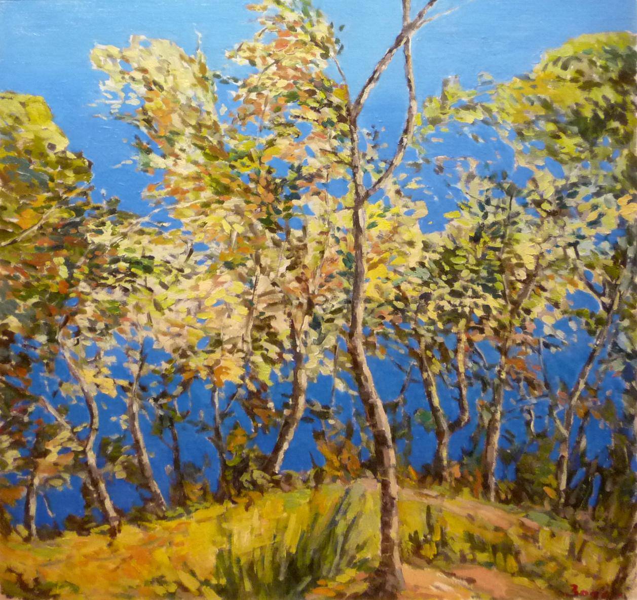 Obraz przedstawia las, przez który przelatuje lekki powiew wiatru, ukazany za pomocą licznych smug i plam kolorów. Przeważają ciepłe odcienie zieleni i złota, które harmonijnie kontrastują z niebem o intensywnej, błękitnej barwie. Kompozycja wydaje się chaotyczna, jakby drzewa tańczyły w rytmie natury. Światło przenikające przez liście tworzy głęboki, niemal magiczny nastrój. Czujesz to magiczne "coś" w powietrzu, jakby las szeptał swoje tajemnice. Styl artystyczny, przypominający impresjonizm, ujmuje swobodnym użyciem pędzla i skupieniem na grze światła. Techniką używaną przez artystę jest prawdopodobnie impastowanie barw, które nadaje obrazowi teksturę i głębię. Takie dzieło może wywoływać różnorodne emocje. Od beztroskiej radości po nostalgiczną tęsknotę za utraconym czasem. Ja zawsze myślę, że taki obraz to jak drzwi do innego świata. Myślę, że nie można go tylko zobaczyć, trzeba go poczuć. Kolor niebieski sprawia, że myślę o "freedom", o wolności, która jest jak wiatr. A jak się przyjrzysz, to prawie słyszysz te liście, tak jak mówił dzieciak obok mnie: "Drzewa szepczą do siebie". To niesamowite, że sztuka potrafi przenosić nas w inne miejsce i czas.