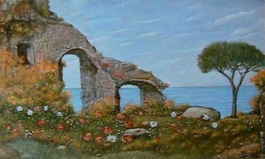 Na obrazie widzimy romantyczny krajobraz z ruinami starego muru, otoczonymi bujną roślinnością. Ściany są szare, pokryte plamami mchu i pnączami. Kolory natury są żywe; zielone trawy i krzewy pełne są czerwonych, białych i różowych kwiatów. Wszystko to znajduje się pod błękitnym niebem pełnym puszystych chmur. Kompozycja jest harmonijna, z wyważonym układem elementów – po prawej stronie widzimy samotne drzewo nad brzegiem spokojnego morza, które jest typowym motywem w sztuce pejzażowej. Nastrój obrazu jest nostalgiczny i pełen spokoju, jakby artysta chciał, żebyśmy na chwilę zatracili się w tej idyllicznej scenie. Farby nakładane są w sposób delikatny, co nadaje dziełu subtelności i unikalnego uroku. Techniki impresjonistyczne nadają mu lekkość i „dream-like” klimat. Utwór wywołuje uczucie tęsknoty za bezczasowym pięknem natury, jakbyśmy patrzyli na wspomnienie z dzieciństwa. Patrząc na to wszystko, czuję się jak podróżnik, który odkrywa zapomniany świat. Mały chłopiec mógłby powiedzieć „O, jakie to piękne!” Na obrazie jest coś magicznego, co sprawia, że chcemy się tam znaleźć, słuchać szumu fal i po prostu być. Ruiny przenoszą nas w czasie, a przyroda przypomina nam o niezmiennym cyklu życia.
